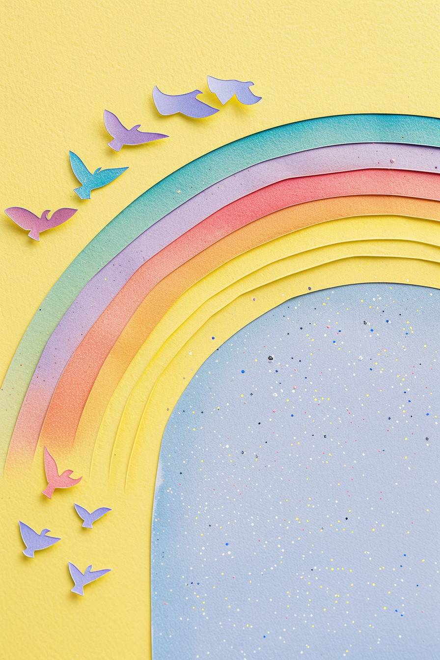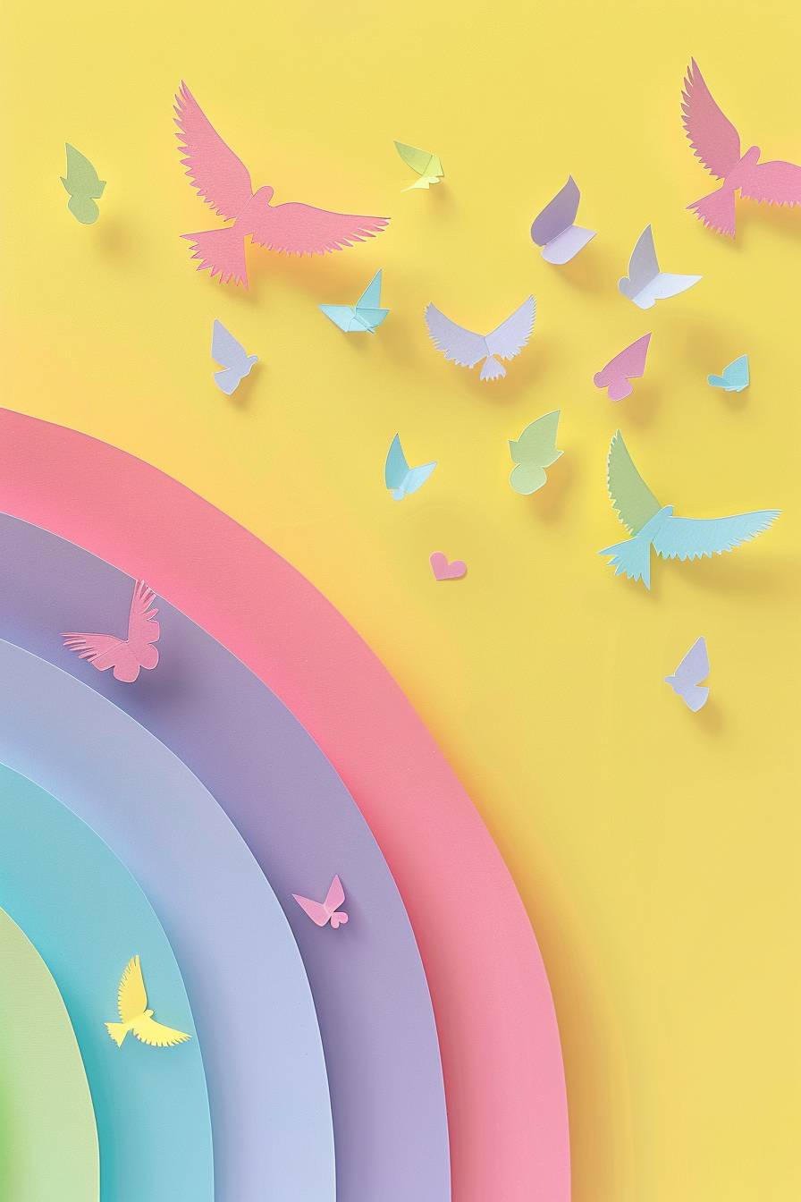 a pastel colured rainbow in pastell purple, pink,blue,light green and light yellow, a simple light pastel yellow background, as an icon in6 the style of David Shpeiker, flat design, simple shapes, tiny birds flying,a very simplified version of cutout paper collage on textured cardboard --ar 2:3 --v 6.0