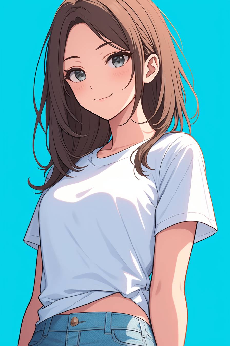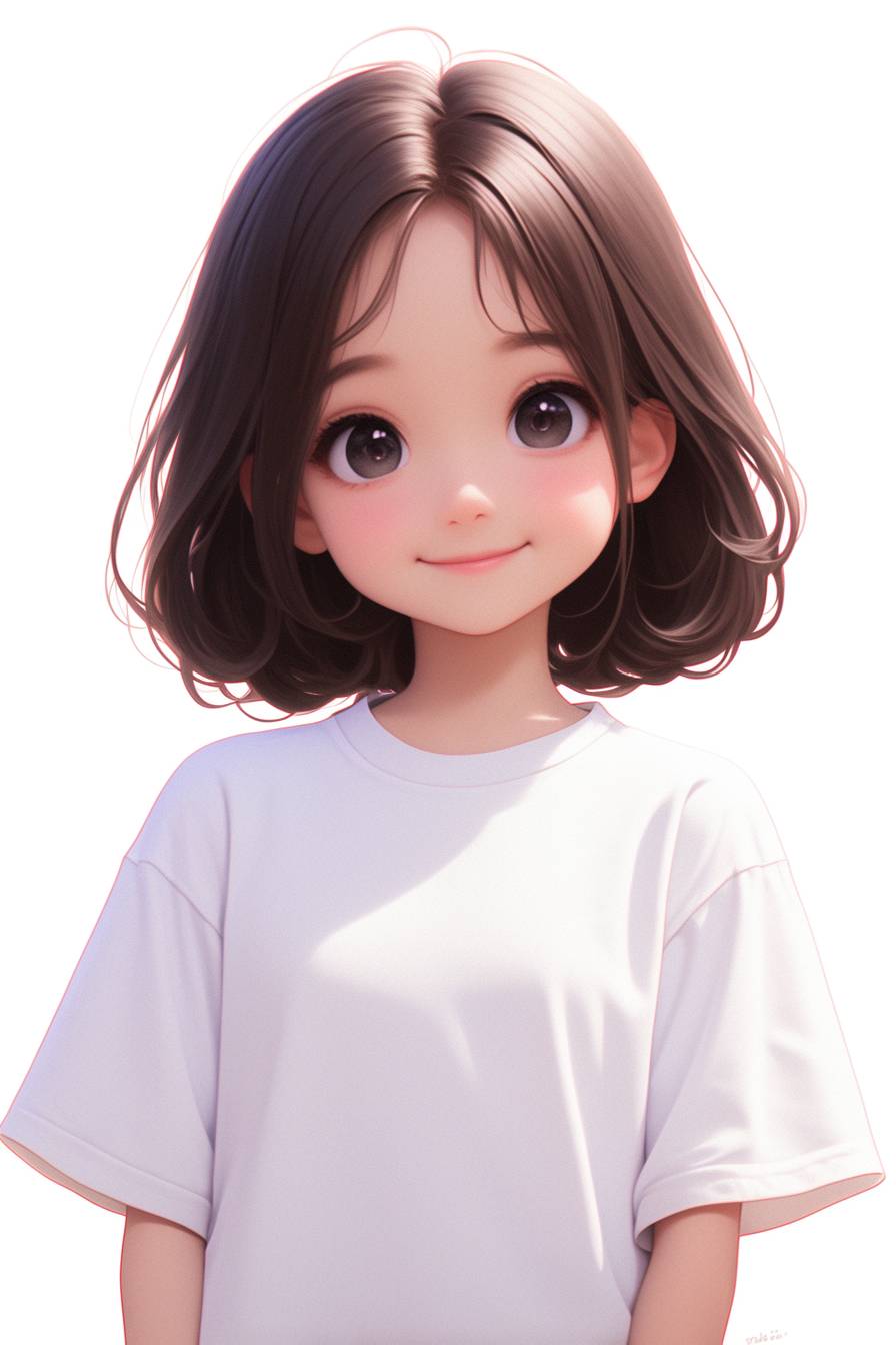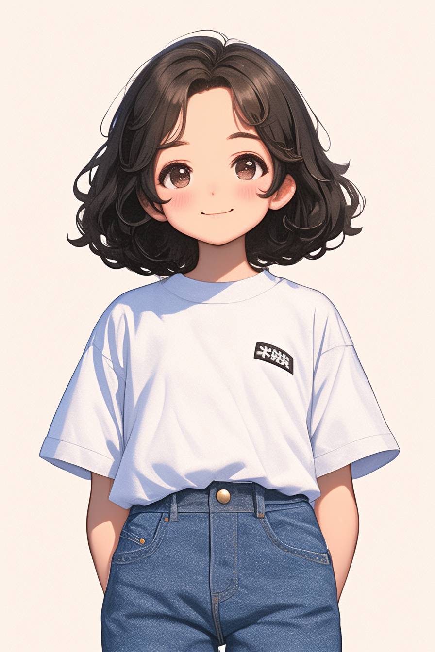 a little girl wearing a white t-shirt and blue jeans smiled at me, illustrations, digital art, using vivid colors such as blue, yellow, green, etc., to create a slightly relaxed and witty atmosphere of the scene, with detailed character design, cute style. --ar 2:3 --stylize 1000 --niji 6