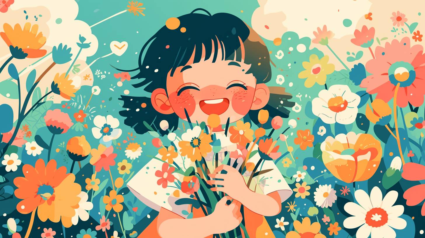 A cute [subject: child/animals], [action], [place environment], transmit a feeling of childish innocence and happy emotions, vector illustration, flat illustration, pastel colors, simple design, soft lighting and a warm atmosphere, --ar 16:9 --niji 6