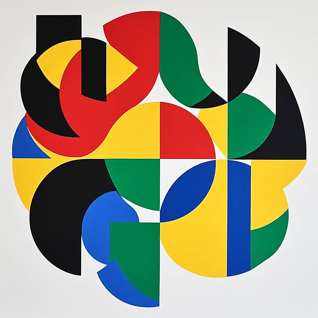 musesai, crafted in minimalist geometric shapes; each letter formed by simple overlapping circles and triangles in bold primary colors—red, yellow, blue, and green; set against a clean white background for maximum contrast; the design is abstract yet recognizable, inviting viewers to engage with the composition; sharp lines and crisp edges enhance the modern aesthetic; composition is balanced and symmetrical, emphasizing harmony and unity; the use of basic shapes and colors reflects purity and universality; overall effect is playful, innovative, and visually stimulating, offering a fresh interpretation of the word through minimalist design.