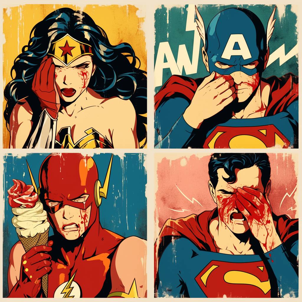 A series of four pop art posters featuring iconic superheroes in various emotional states, conveying different emotions while maintaining a comic book style.