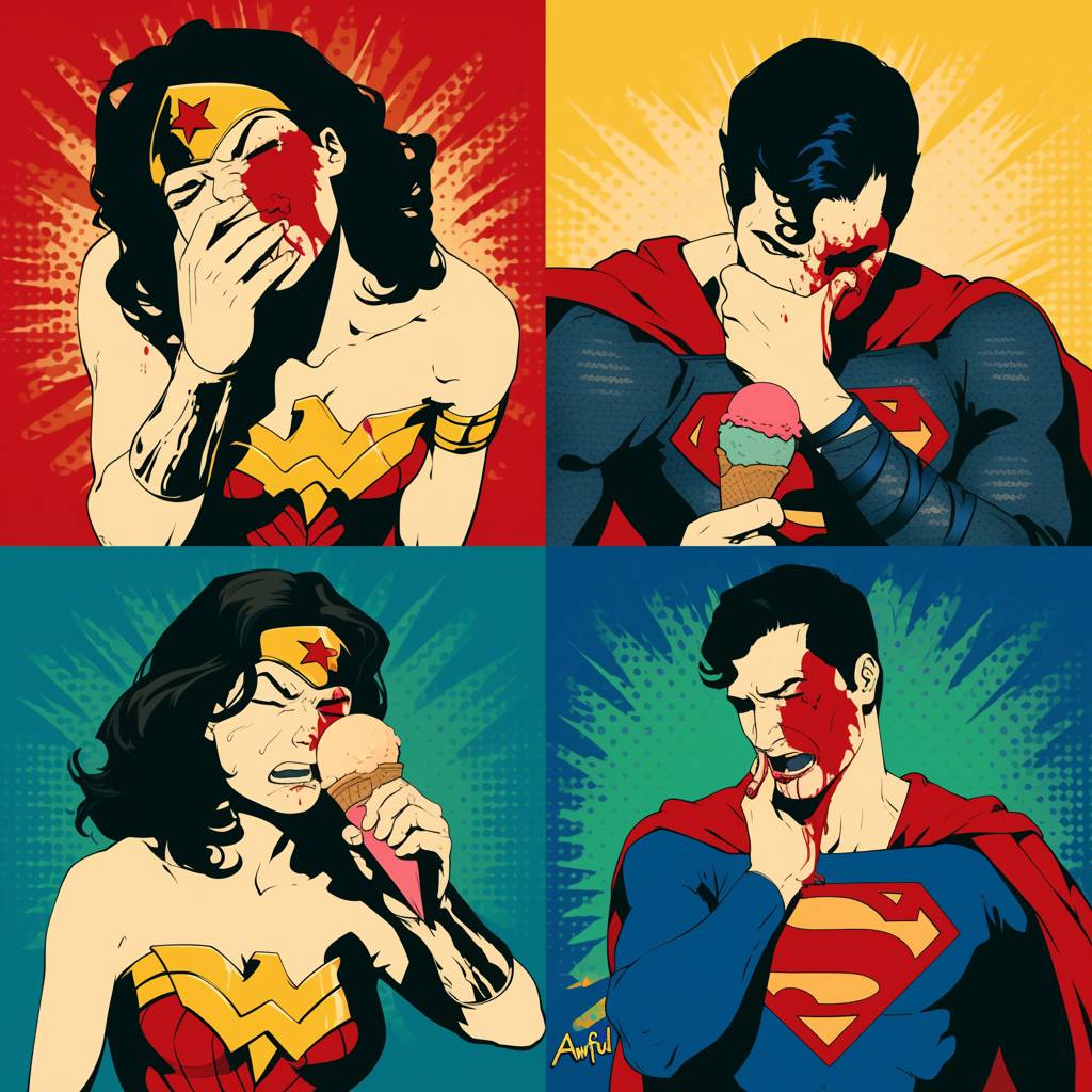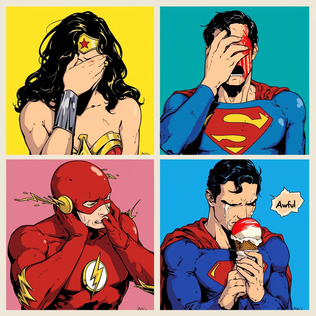 A series of four pop art posters featuring iconic superheroes in various emotional states and the text "Awful", including Wonder Woman with her hand covering her face, Captain America's face covered in red paint splattered across his helmet, The Flash crying with an ice cream cone, Superman crying bitterly, all set against contrasting backgrounds that highlight their expressions and symbols. This composition captures different emotions while maintaining a comic book style. --style raw --niji 6