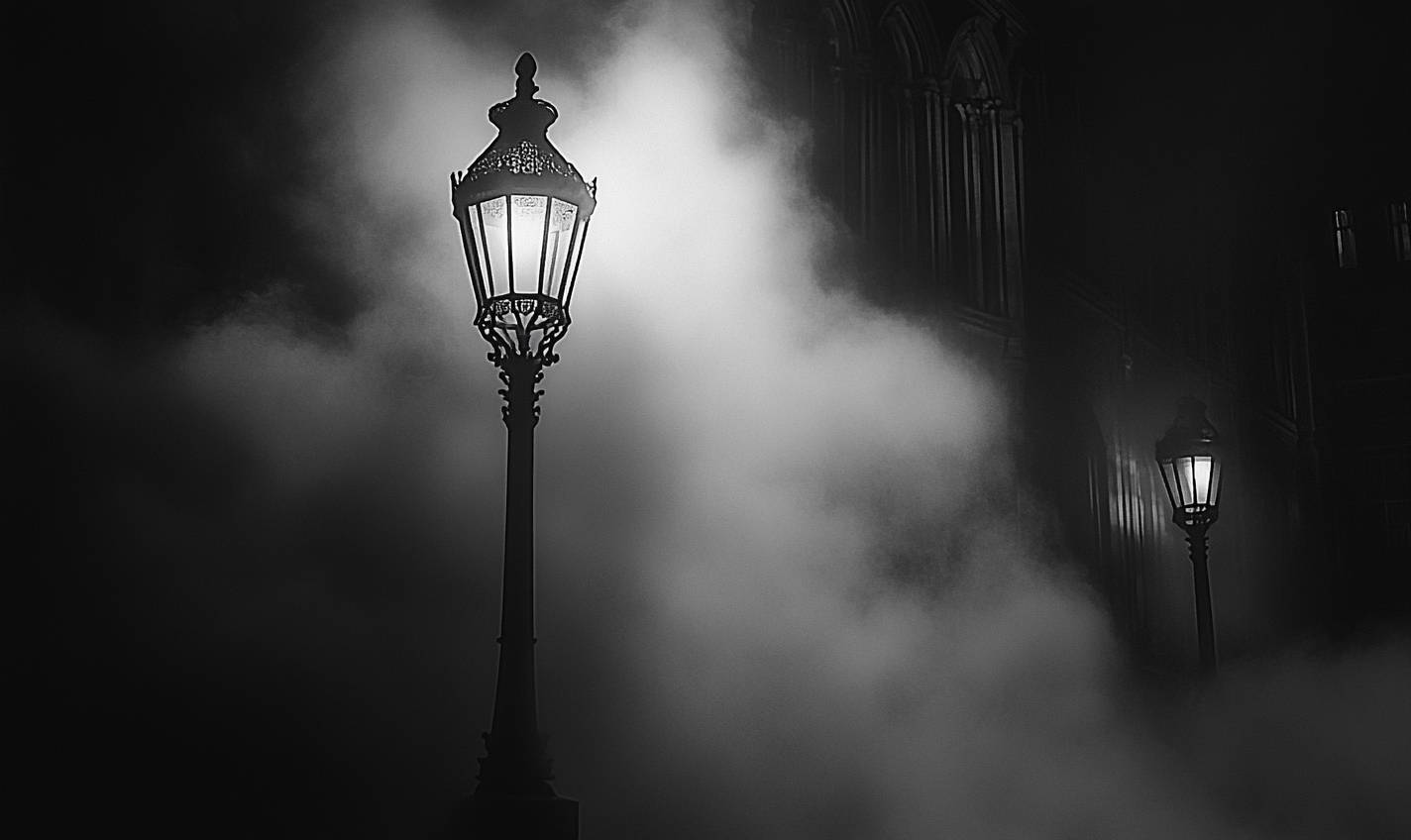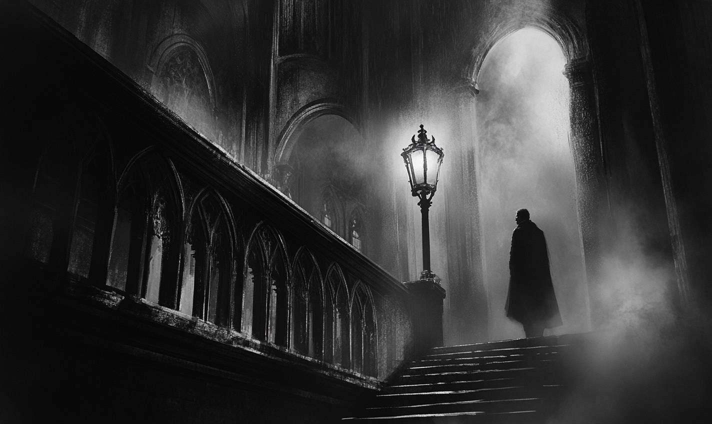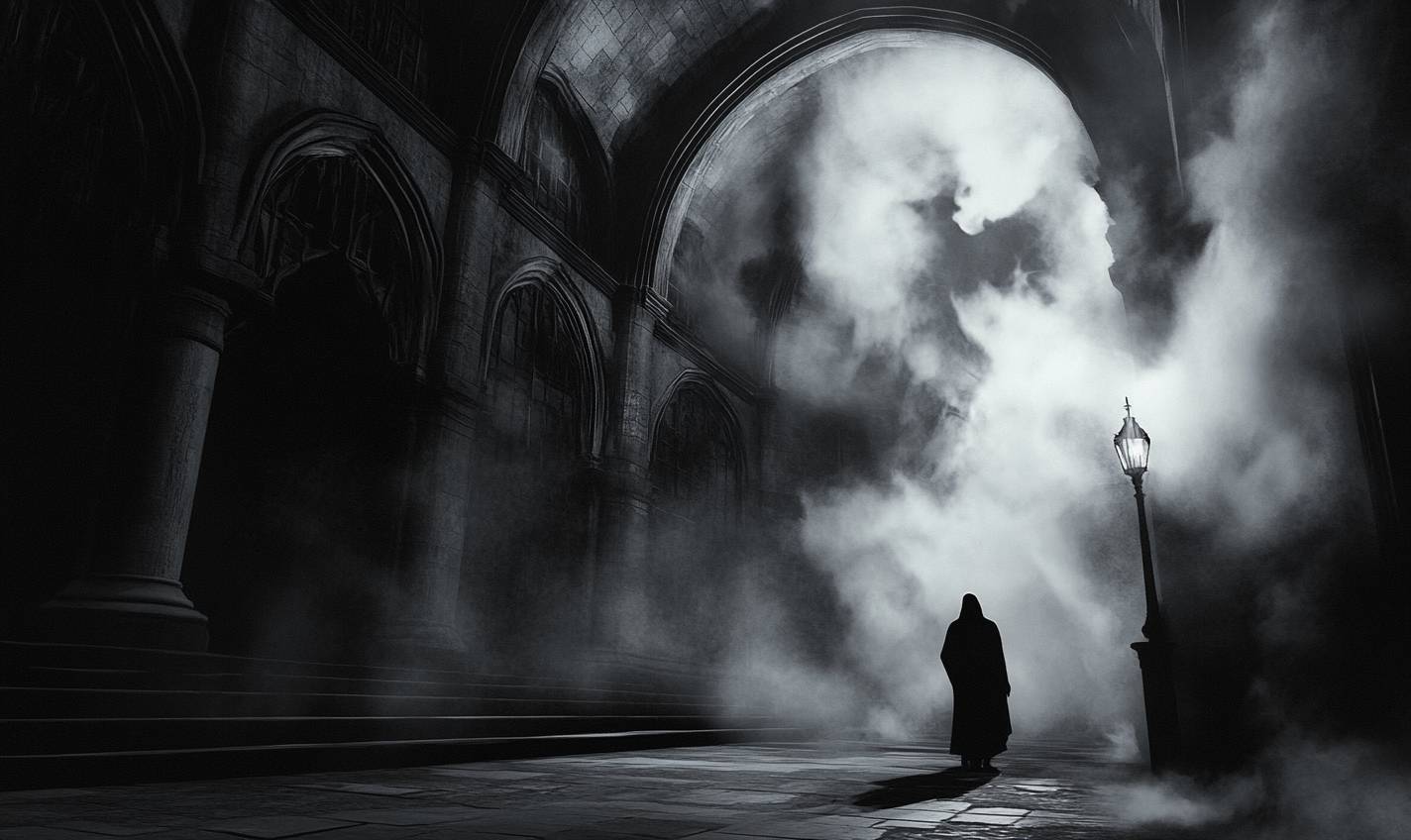 adrift in a Gothic Noir Dreamscape. Rendered in stark black and white with film noir lighting, emphasizing dramatic shadows and a sense of mystery. Incorporate elements of Gothic architecture, swirling mist, and perhaps a lone, flickering streetlamp.