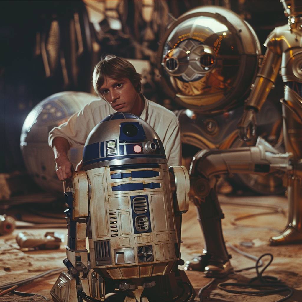 A character from Star Wars directed by George Lucas in an action scene at a specific location, using a 70's analog camera, saturated colors, and detailed composition.
