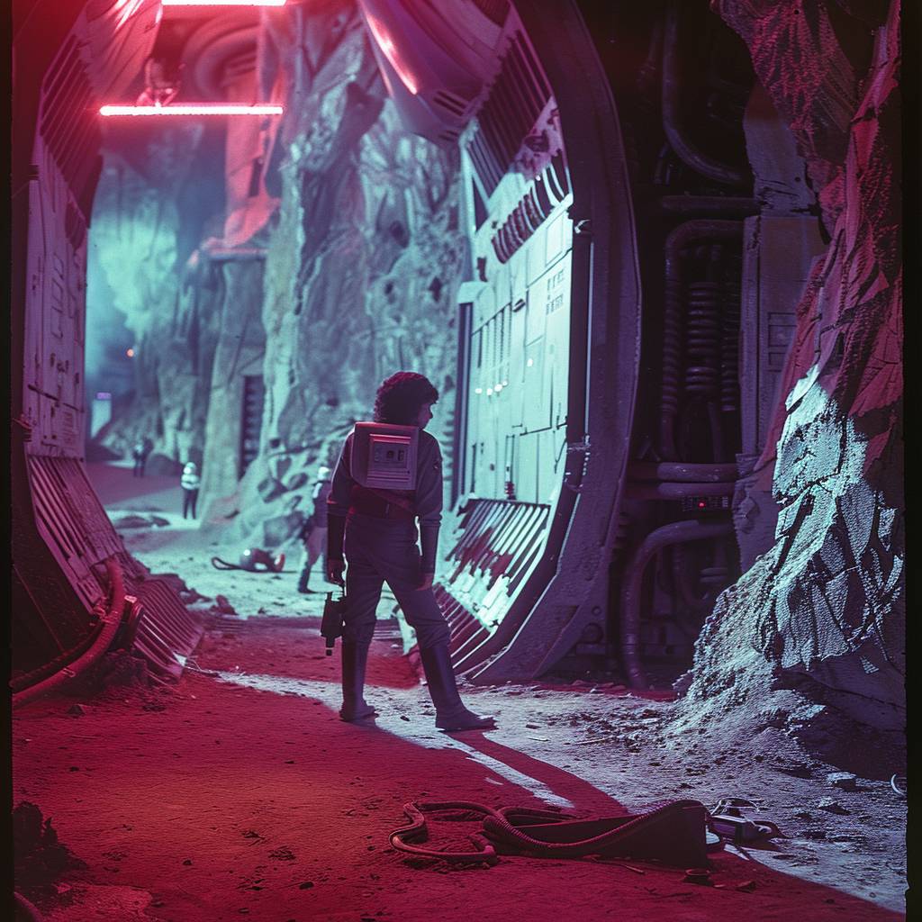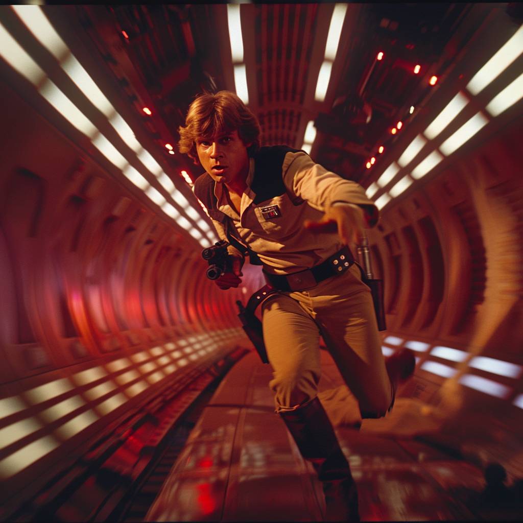 Film still Star Wars [character] in action scene [location], [scene], [lighting], [angle] analog camera, 70's, saturated colors, detailed composition, directed by George Lucas --v 6.0