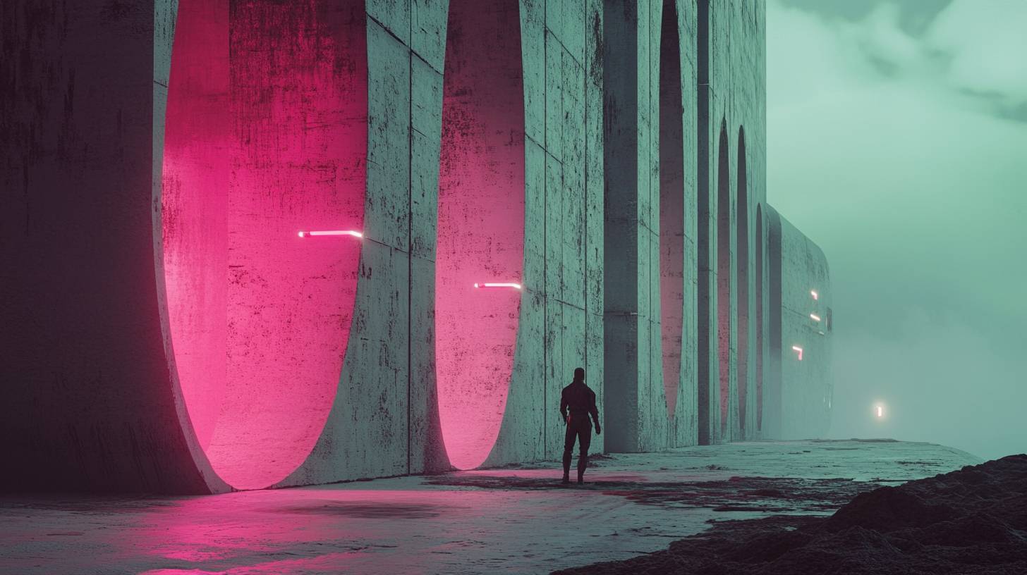 In a retro-futuristic dystopia, blending 1950s aesthetics with futuristic elements.