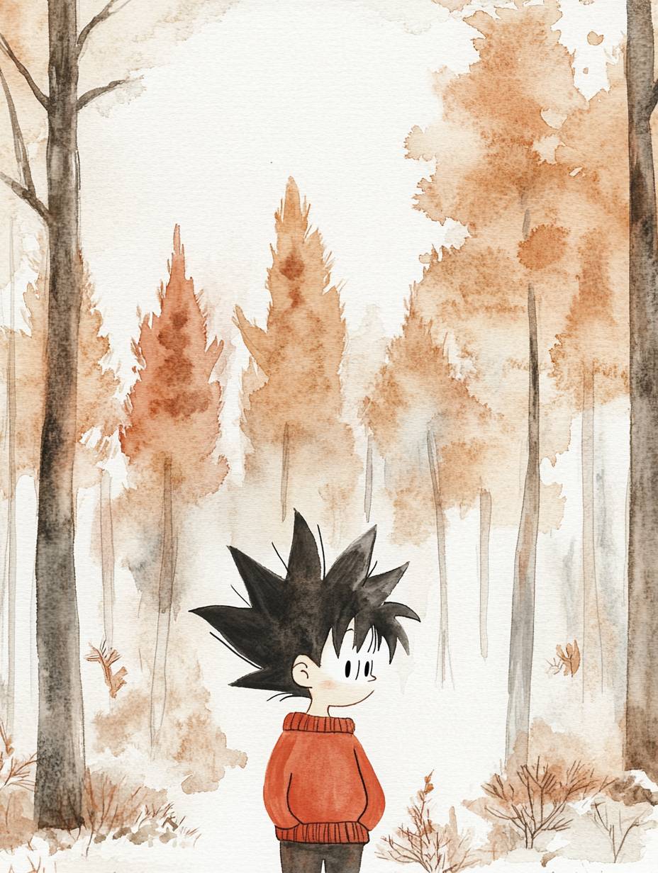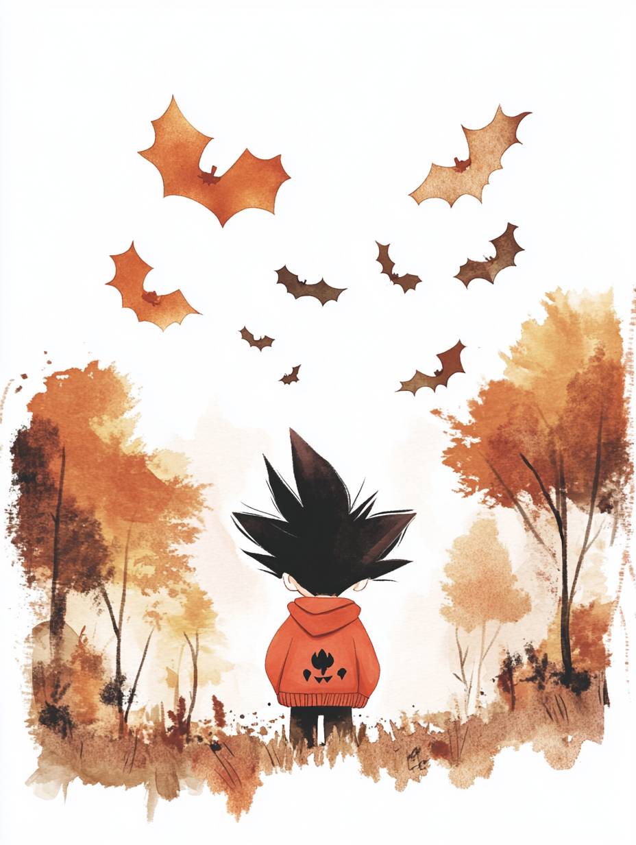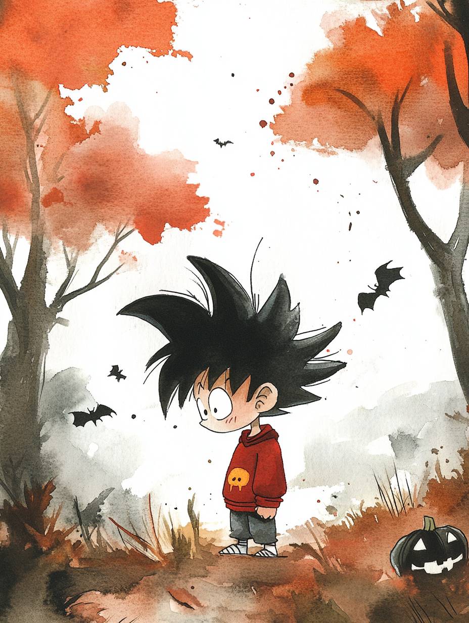 A simple watercolor illustration of Goku wearing a red Halloween sweater, with a Halloween forest scene in the background. In the style of Jon Klassen, minimal style, soft colors, with a children's book aesthetic, no shadows, creating a scene reminiscent of a painted Halloween card.