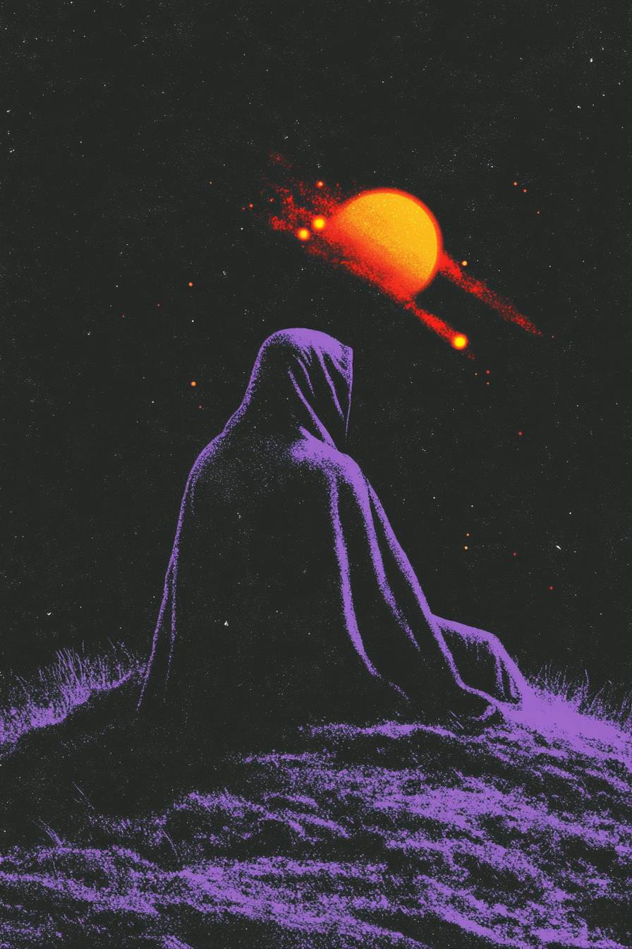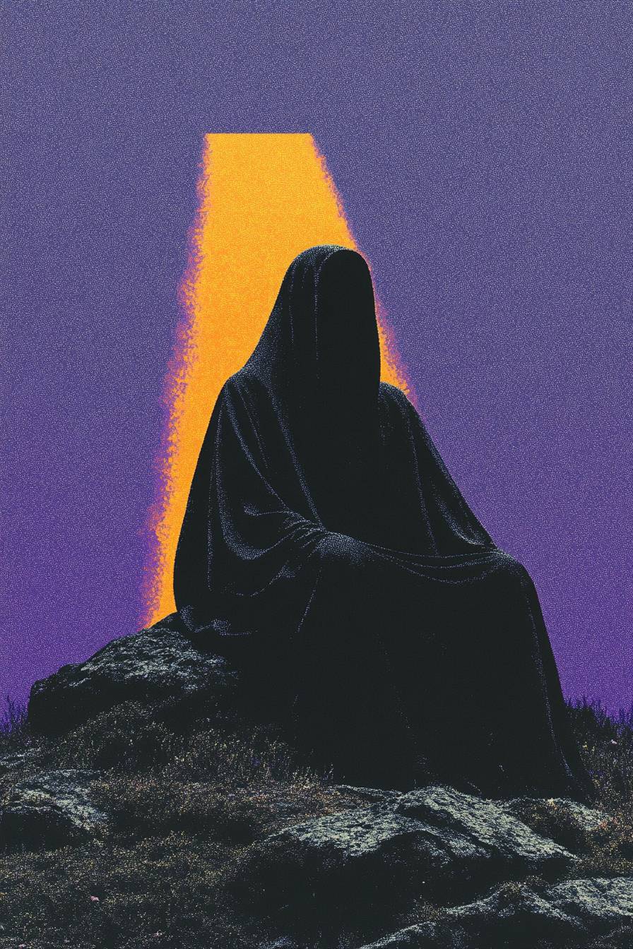 A hooded man at the hilltop showcases his power of lights, surreal art.
