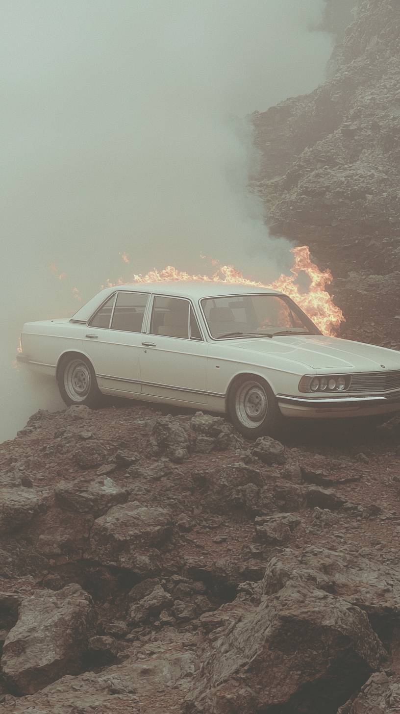 being, car on fire falling off cliff on fire, dark pale colour pallet,nostalgic , rule of thirds, poster, nostalgia --chaos 30 --ar 9:16 --quality 2 --personalize hos1t17 --stylize 1000 --v 6.1