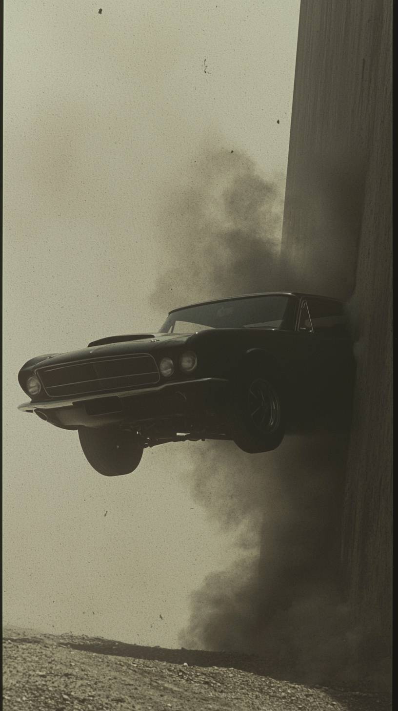 A car on fire falling off a cliff, dark pale color palette, nostalgic, rule of thirds, poster, nostalgia.