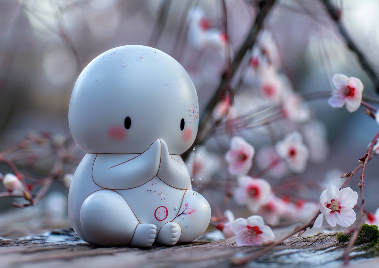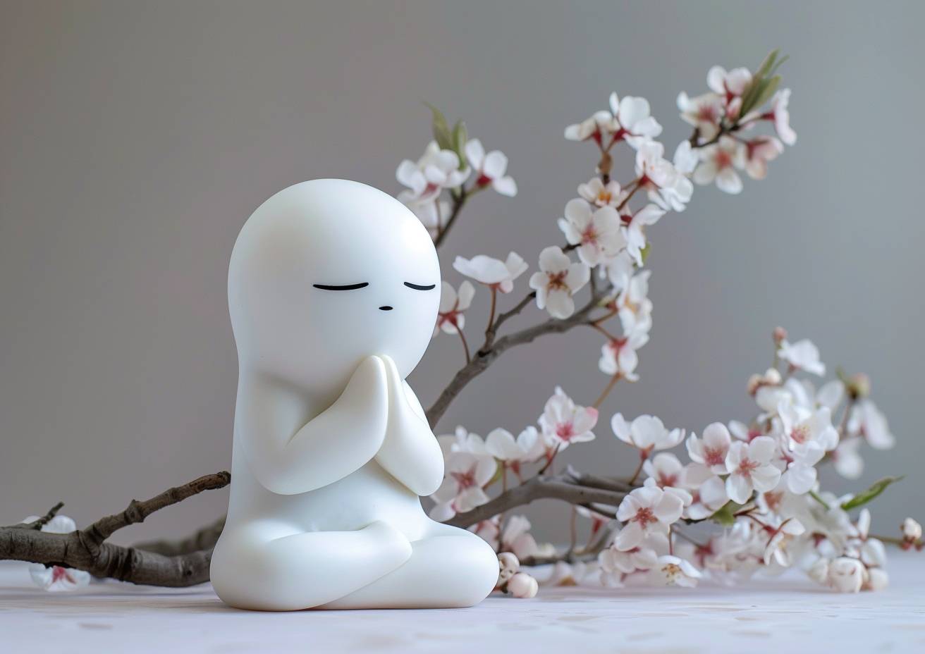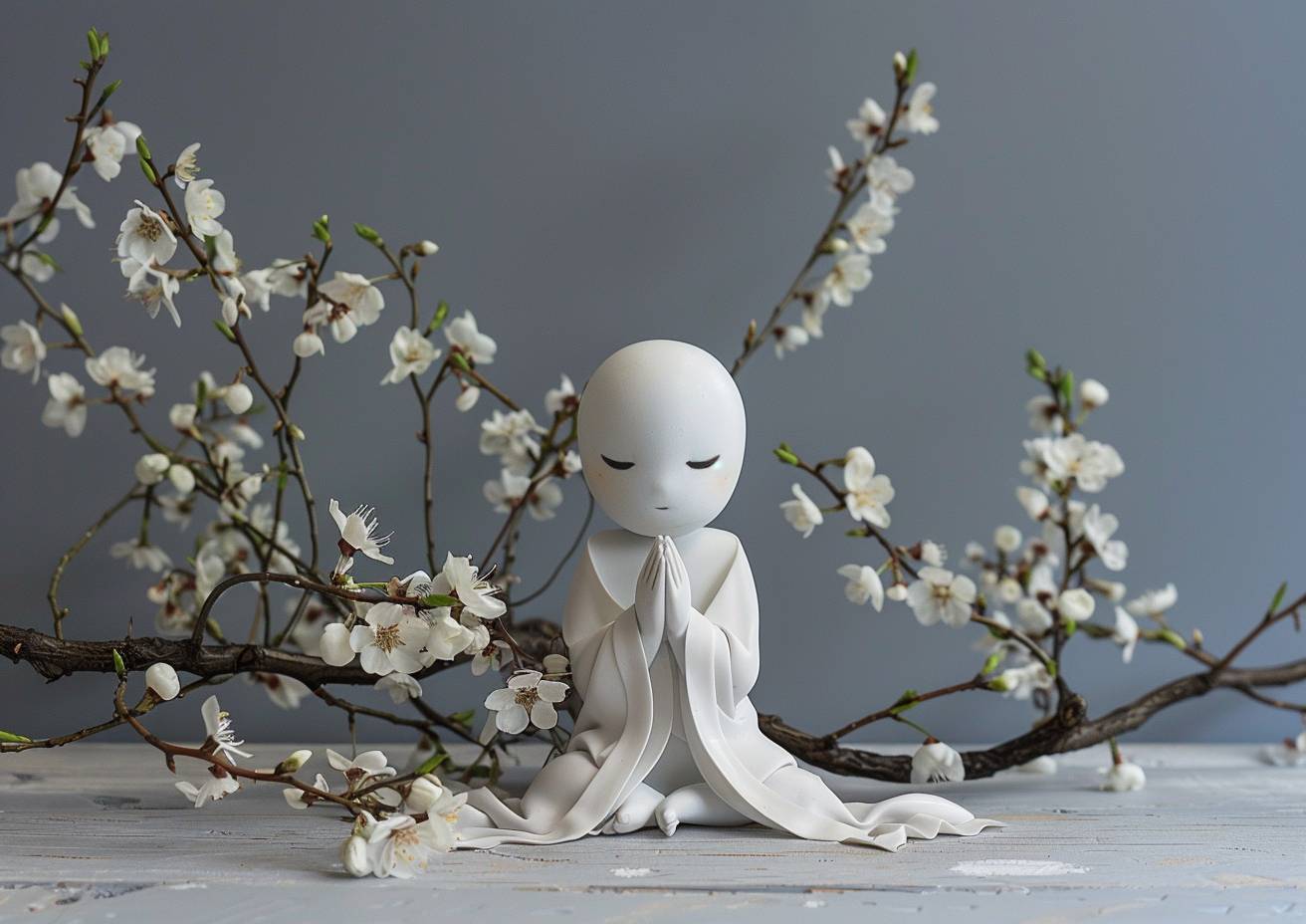 Ghastly glitchpunk white teru teru bozu doll in praying position, blossoms, minimalism