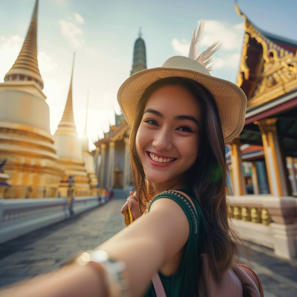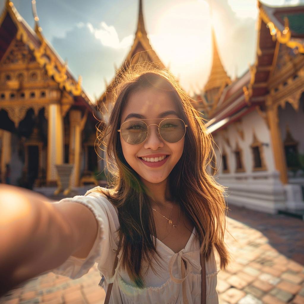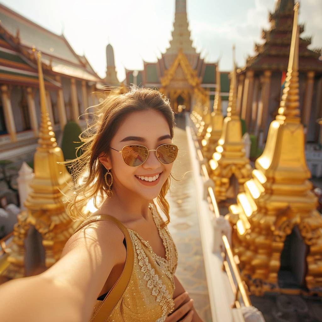A happy young Thai woman taking a selfie in Bangkok, with golden stupas illuminated by the midday sun.