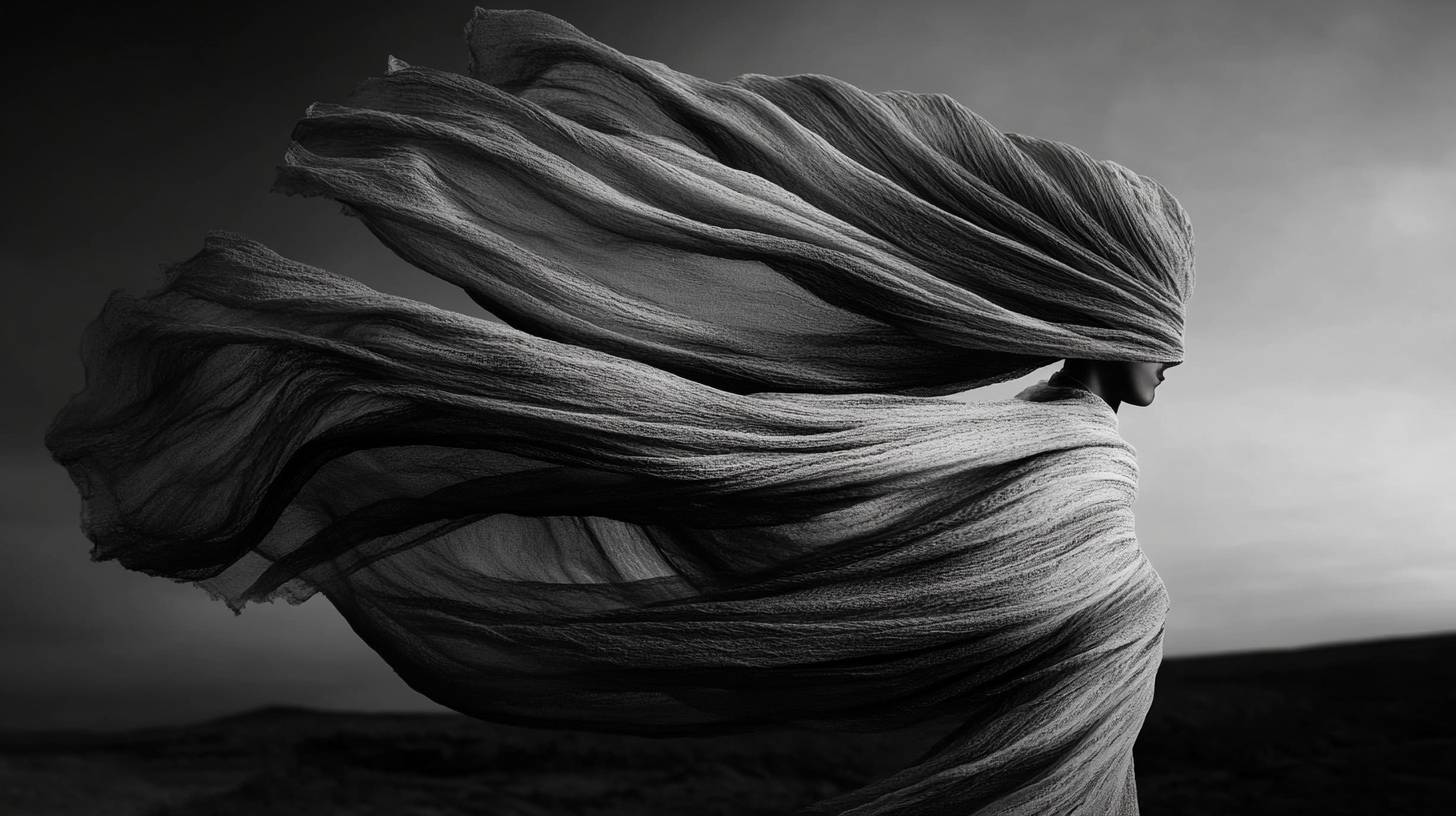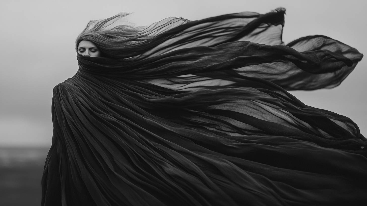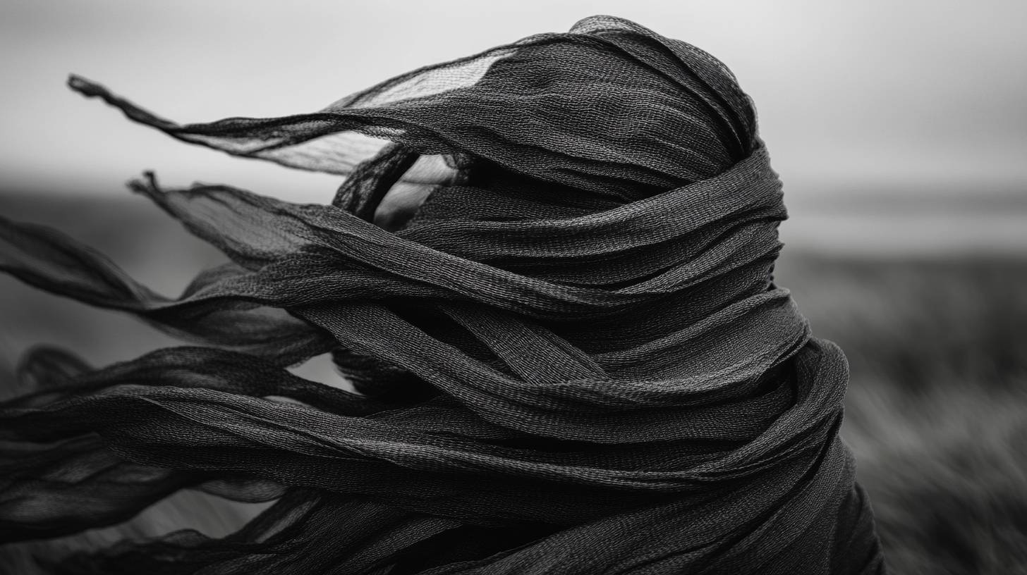 Black ribbons blowing in the wind and black-and-white photography