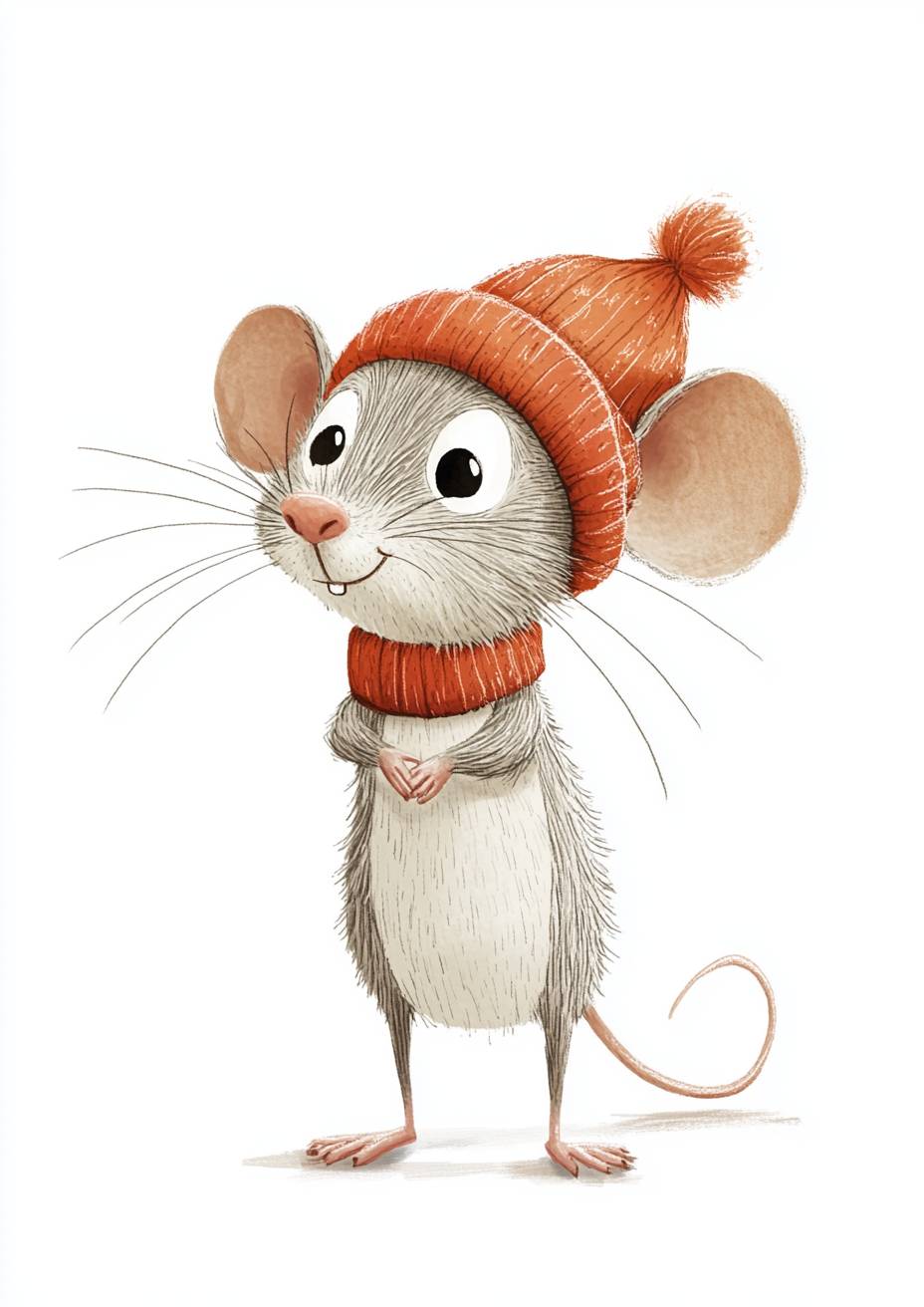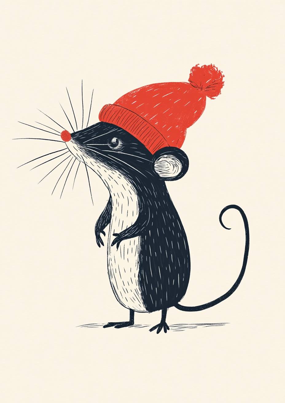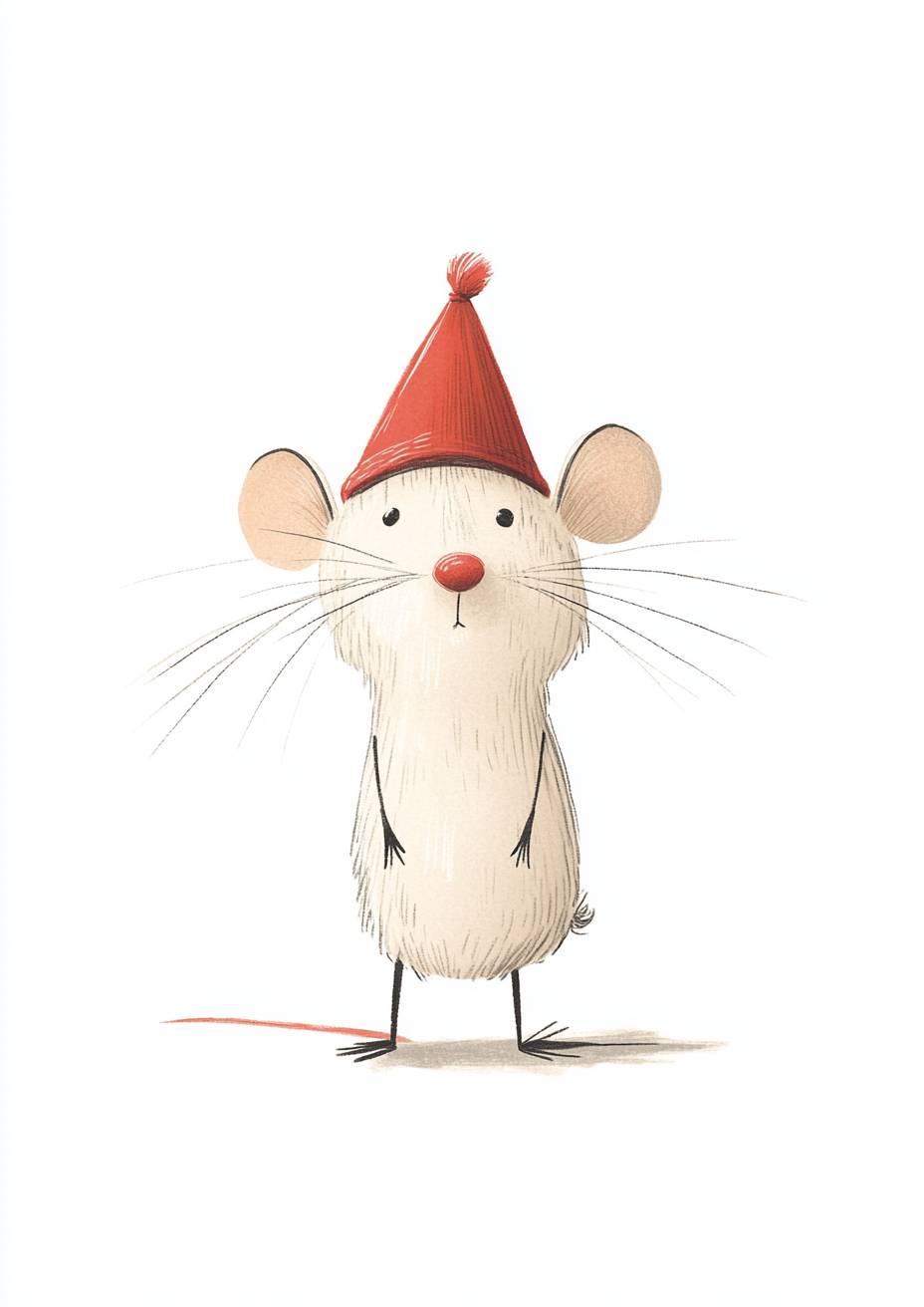 Children's book illustration of a slim line toothpick legged funny mouse with a big nose standing on two feet, wearing a red hat,with a simple color palette in the style of Oliver Jeffers and Picasso, flat white background, --ar 5:7 --v 6.1