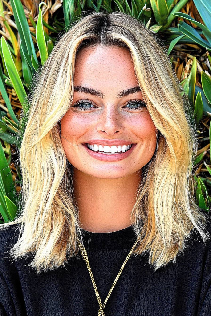 Margot Robbie smiling in an ID photo.