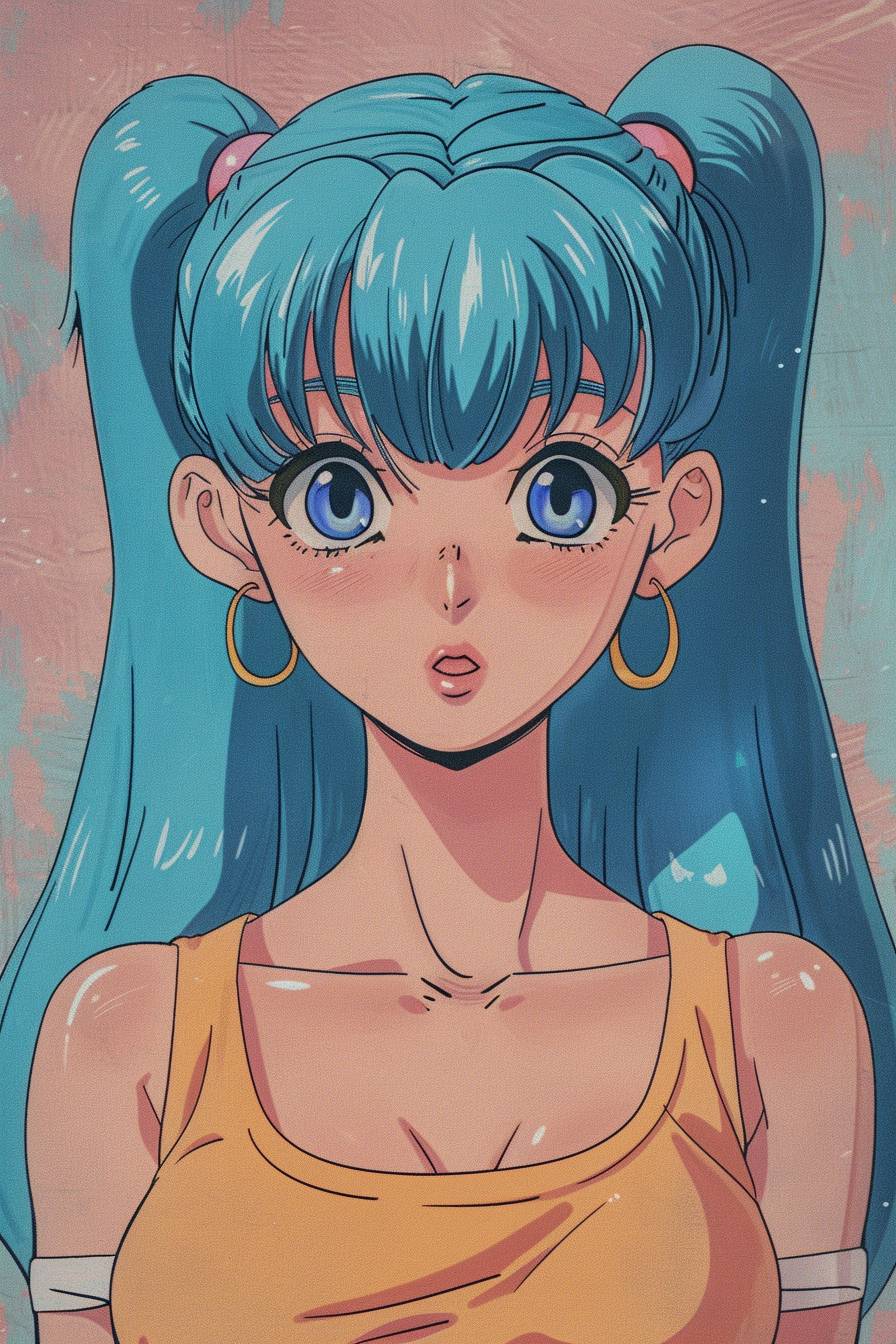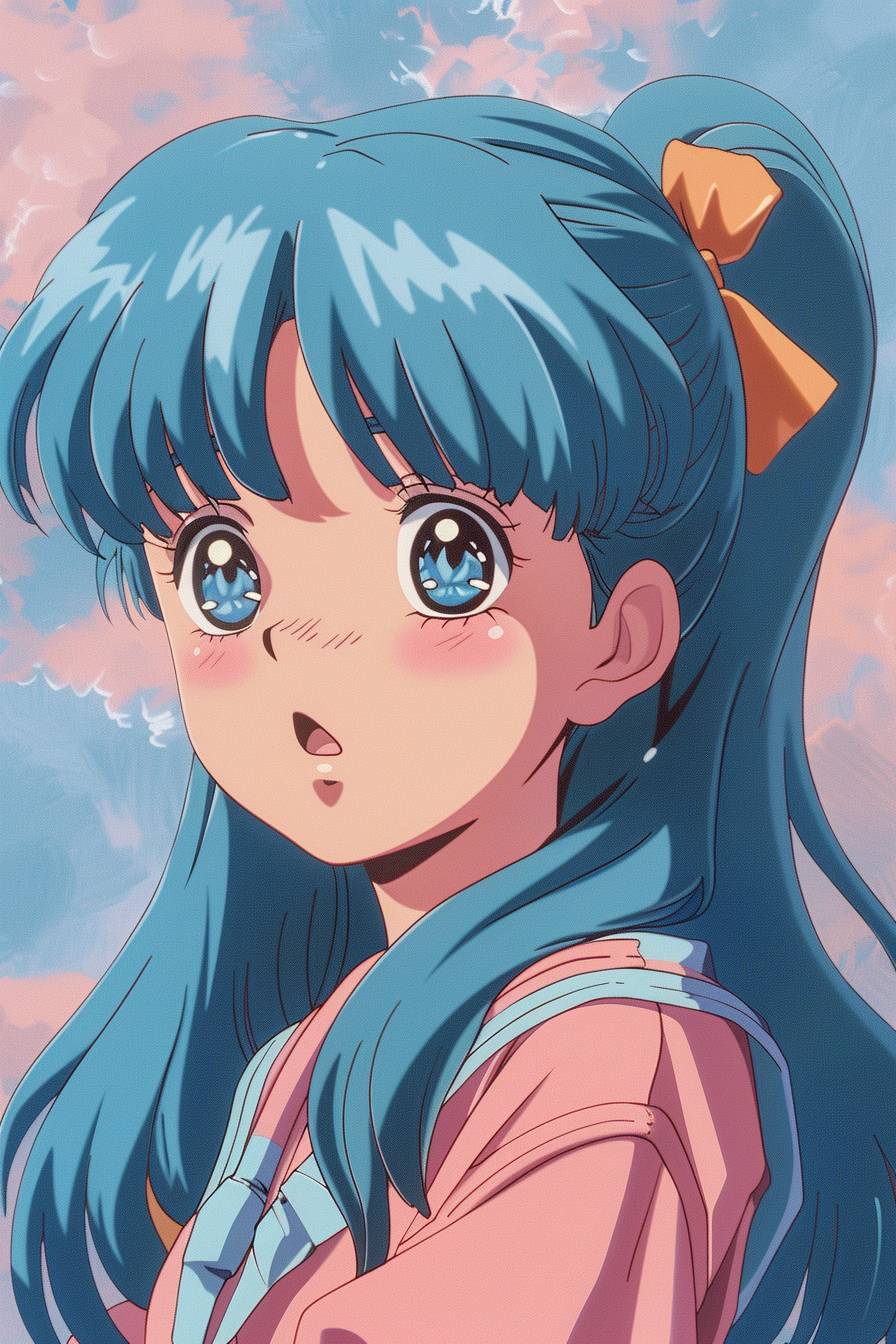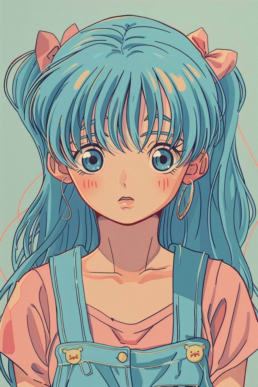 Character in the style of Rumiko Takahashi, resembling Inuyasha animation: big eyes, blue hair with bangs and twintails, wearing a pastel-colored outfit in a 90's anime style.