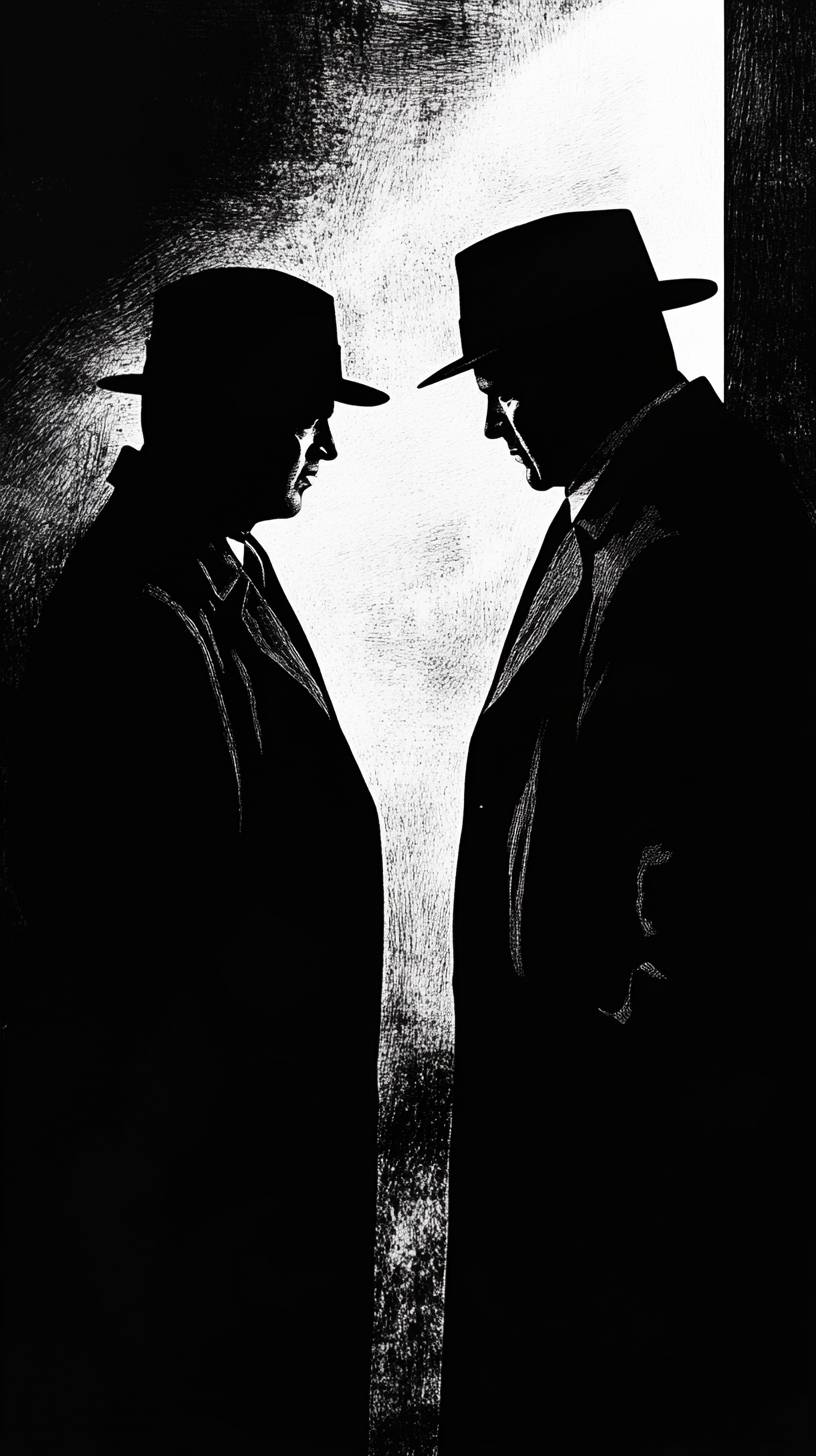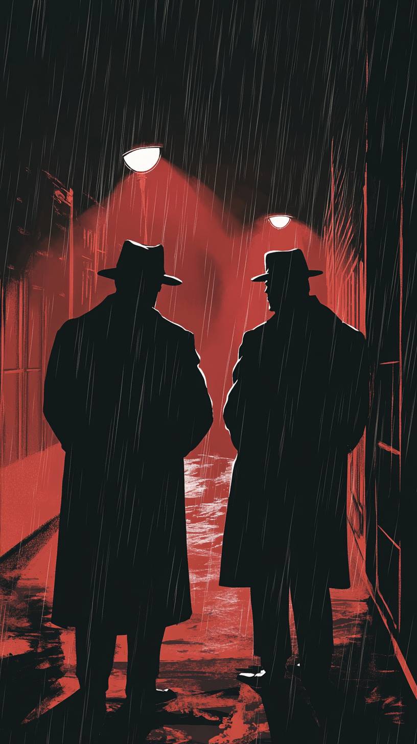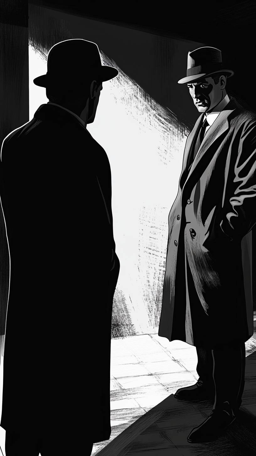 A clandestine meeting between two spies in trenchcoats and fedoras in a film noir graphic novel illustrated style.