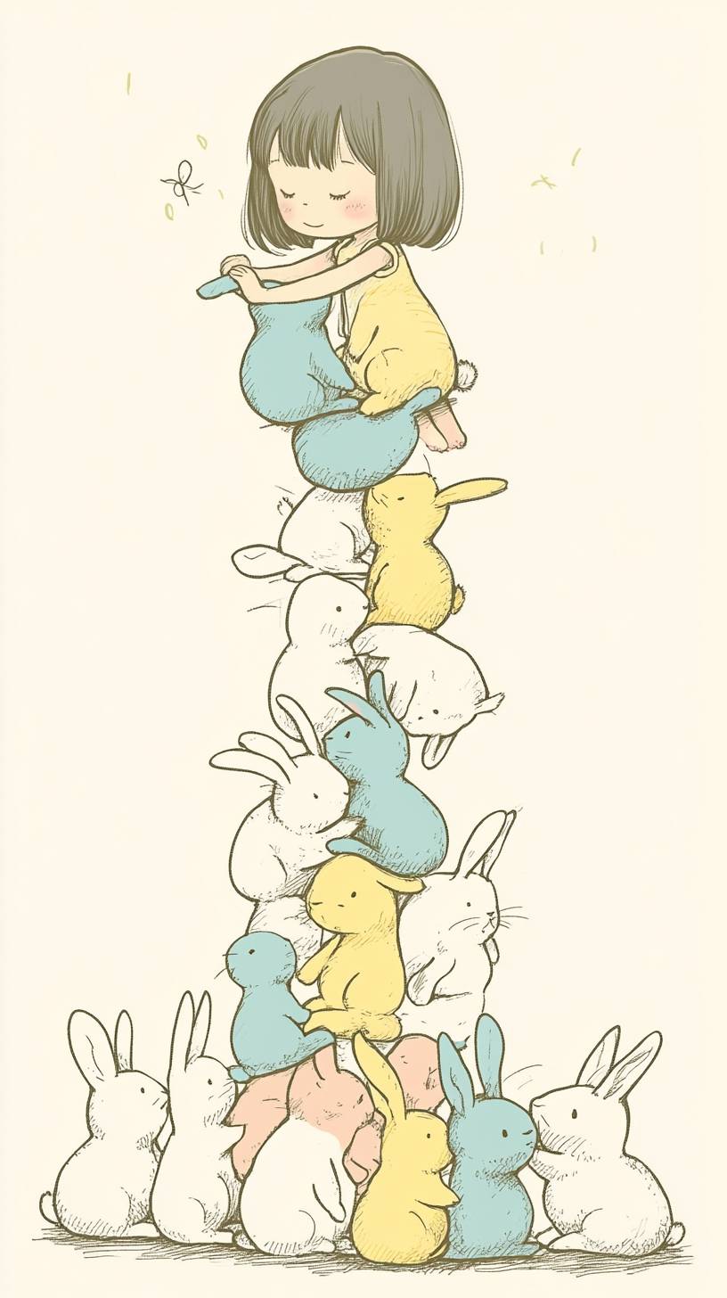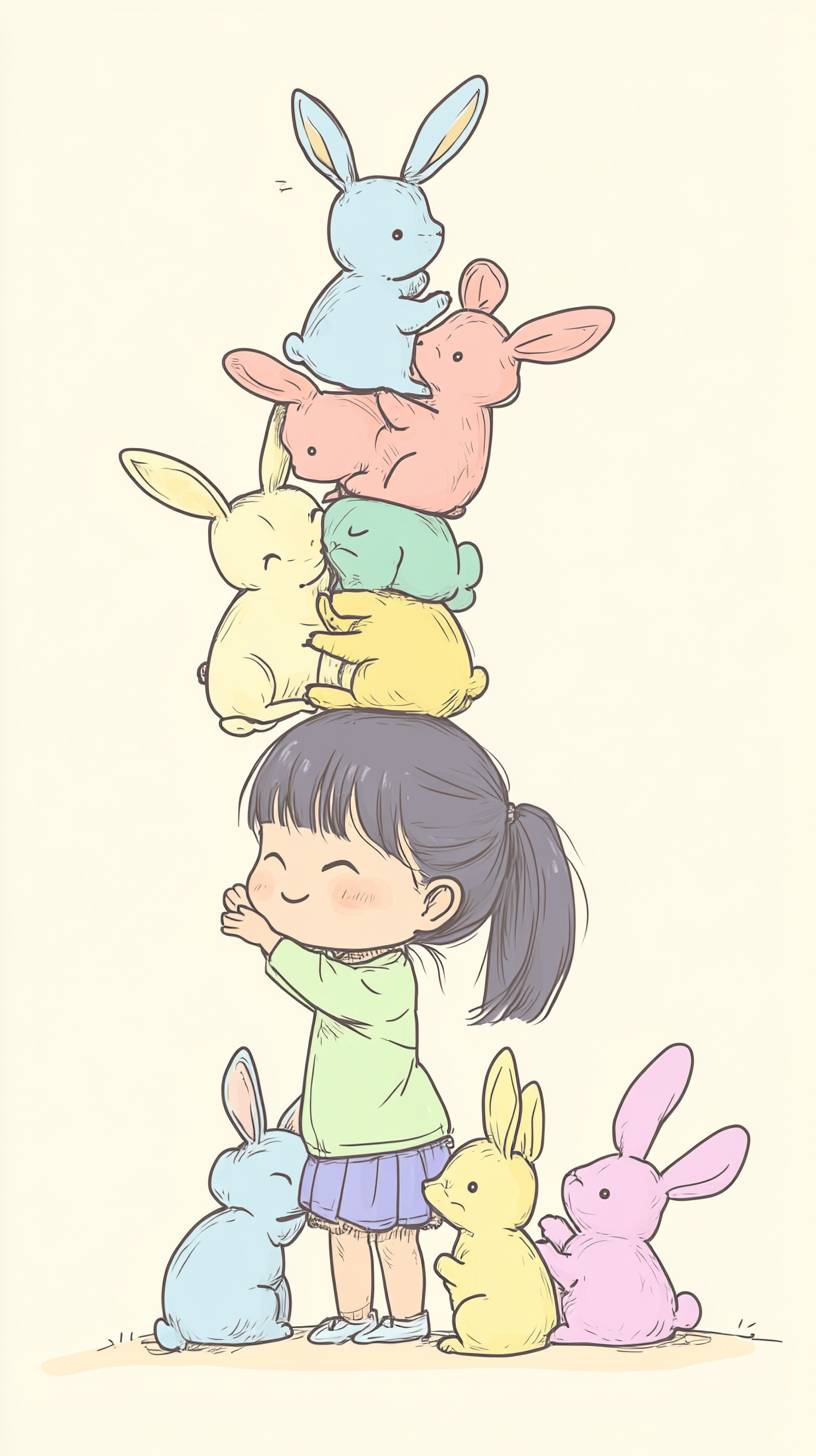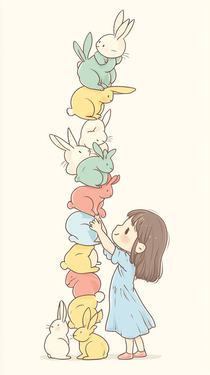 A cute little girl is building an adorable tower of bunnies with different colors and shapes, drawn in the style of Japanese anime. The background color should be light yellow or cream to highlight her small figure against the tall stack of colorful rabbits. Her hair could have bangs for added cuteness, while she wears simple in shades like blue or green. Clipart style, simple line art drawing, white background, high resolution. --ar 9:16