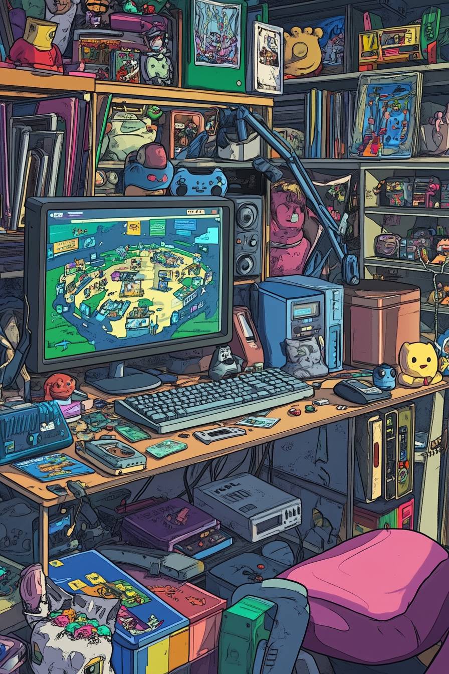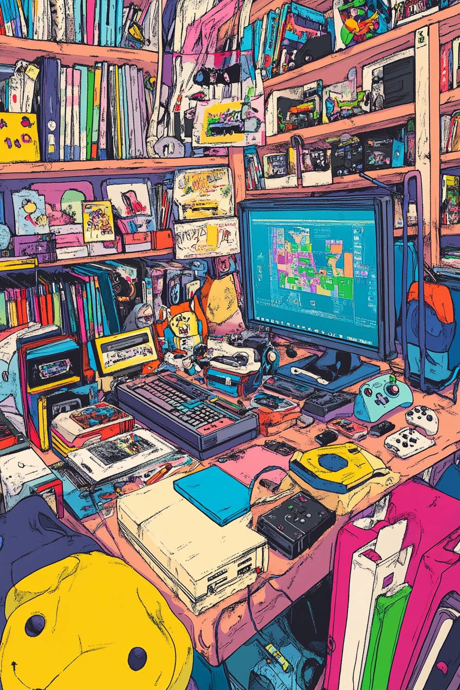 A cartoon-style illustration of an office desk, cluttered with various game consoles and gaming cards, in bright colors, set against the backdrop of a computer screen displaying video game or art software icons. The scene is filled with playful elements like plush toys and colorful books on shelves, inspired by the styles of Moebius, Katsuhiro Otomo, and Jean Giraud.