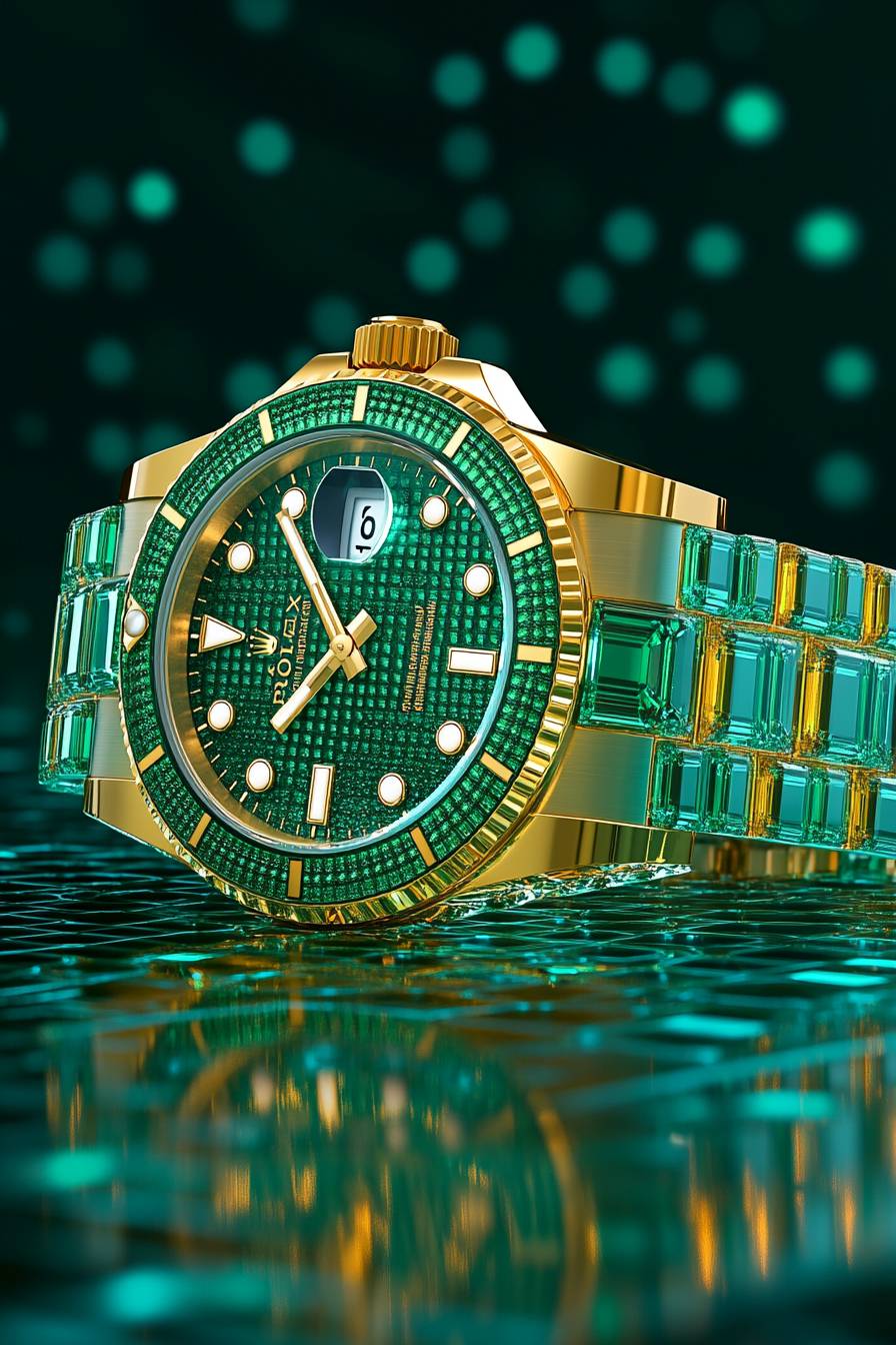 Watch photography, a high-end brand watch, with subtle gold accents, adds a touch of elegance, making the emerald tones appear even more luxurious. Soft, glowing light highlights the watch and the sparkling reflections from the crystal facets, evoking an elegant yet luxurious vibe.