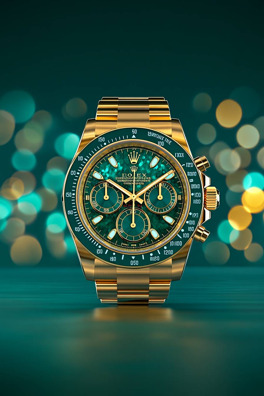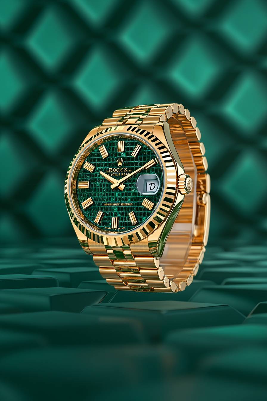 Watch photography, a high-end brand Watch, with Subtle gold accents, add a touch of elegance, making the emerald tones appear even more luxurious. Soft, glowing light highlights the watch and the sparkling reflections from the crystal facets, evoking the elegant yet luxury vibe --c 10 --ar 2:3 --style raw --sref 3774551040 --p ndbewqk --sw 40 --s 200 --v 6.1