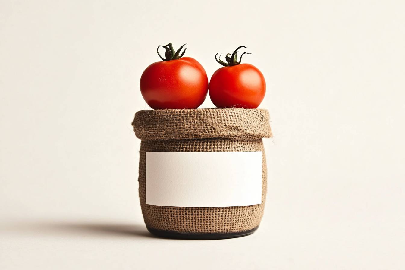 A minimalist mockup of a jar with a white label and lid, topped with four stacked vegetables, including onion and tomatoes, minimalist design with a white background, product photography.