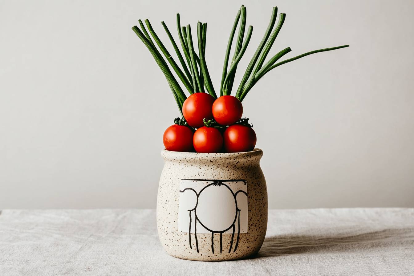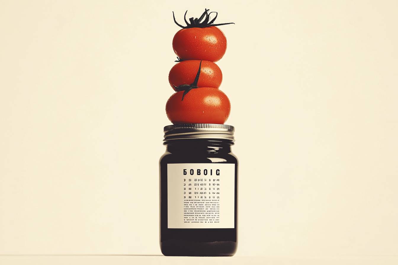 A minimalist mockup of a jar with white label on it and a lid, with four stacked vegetables on top, onion and tomatoes, minimalist design with a white background, packshot product photography --chaos 30 --ar 3:2 --sref 3841075374 --stylize 250