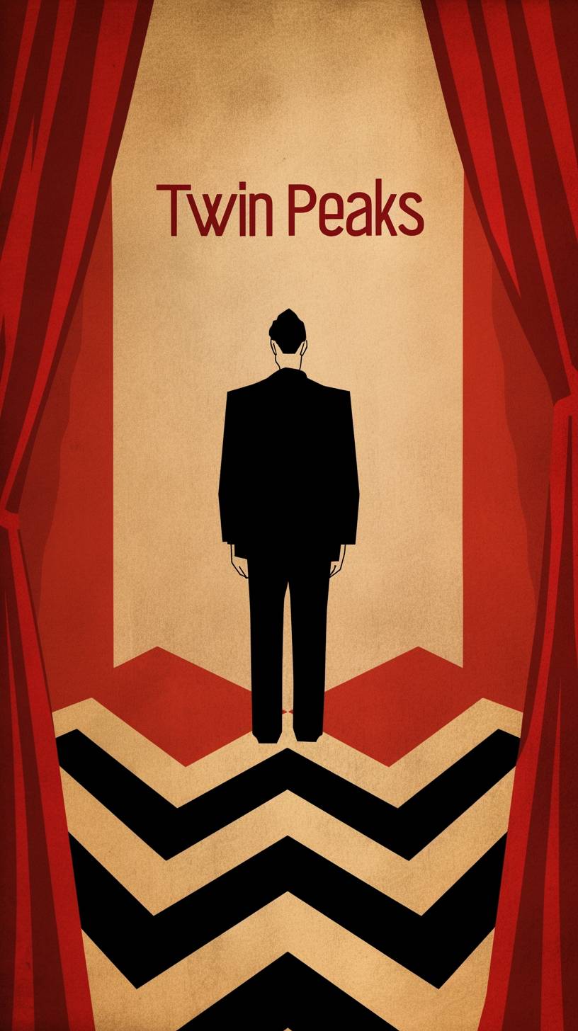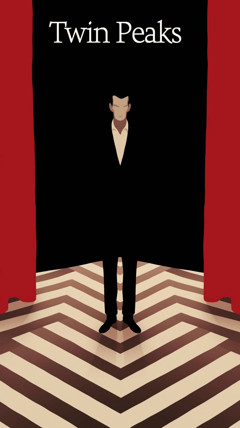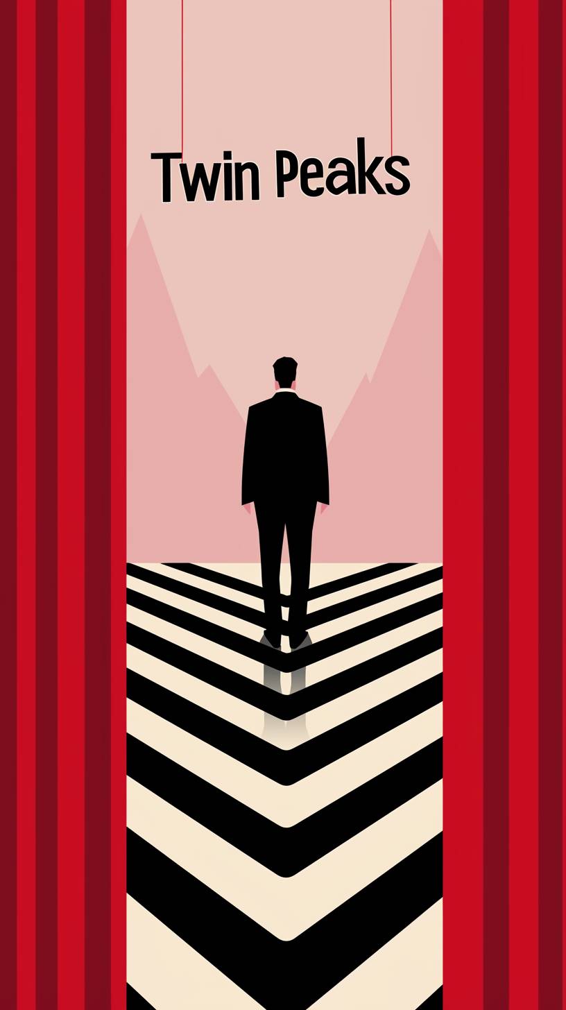 A minimalist movie poster for David Lynch's 'Twin Peaks', featuring a man in a black suit on a chevron-patterned floor, with small text saying 'Twin Peaks' at the top, red curtains, and a simple background in a flat illustration style, conveying the show's mystery and intrigue.