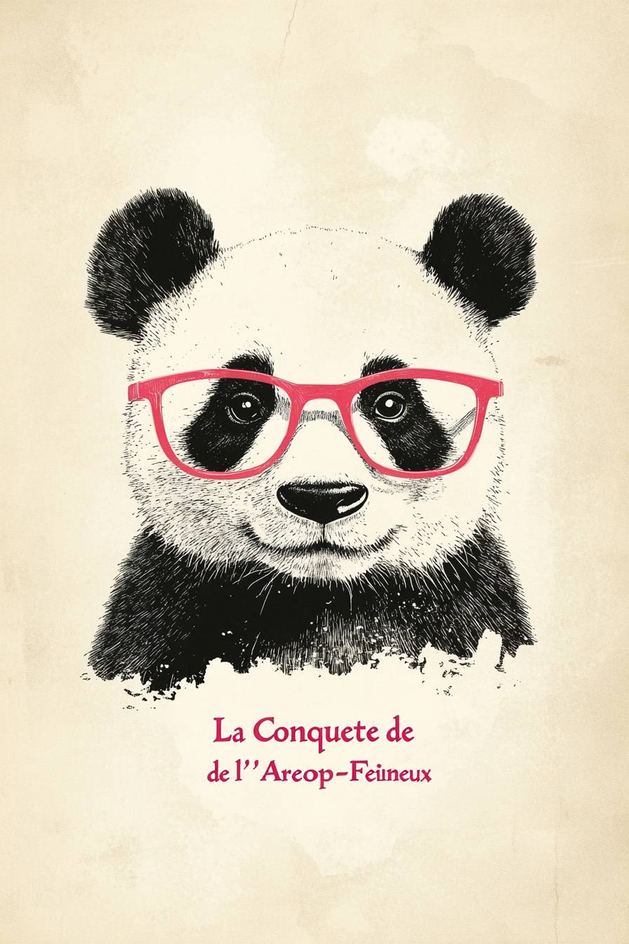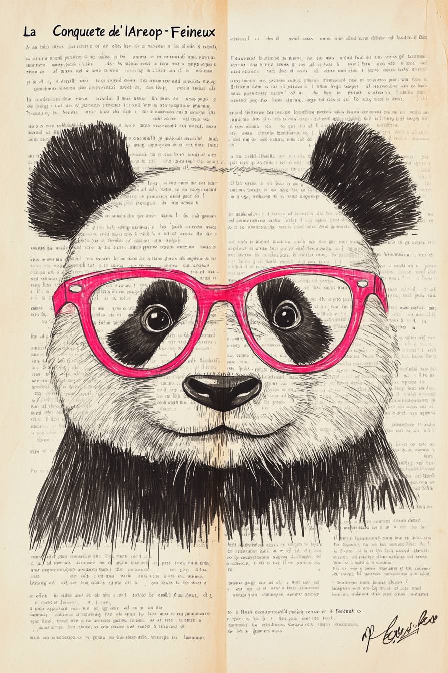 A panda bear with pink glasses and black, depicted in the book 'La Conquête de l'Aréop-Feineux' in the style of Antoine de Saint-Exupéry. The text is printed on an old page of white paper. A minimalist drawing of a cute panda wearing red-framed eyeglasses. Black silhouette, white background, simple drawing, flat illustration, digital art.