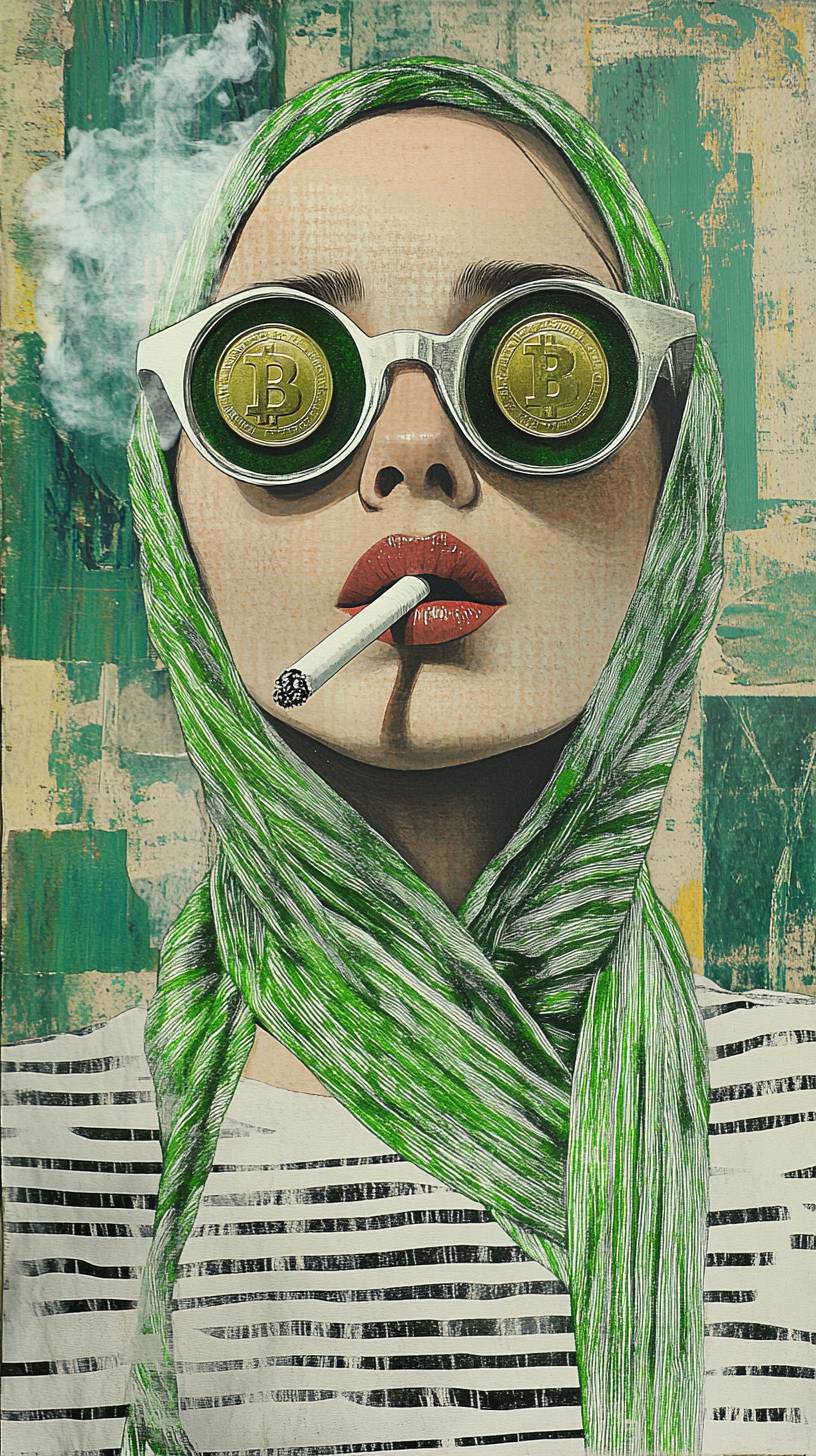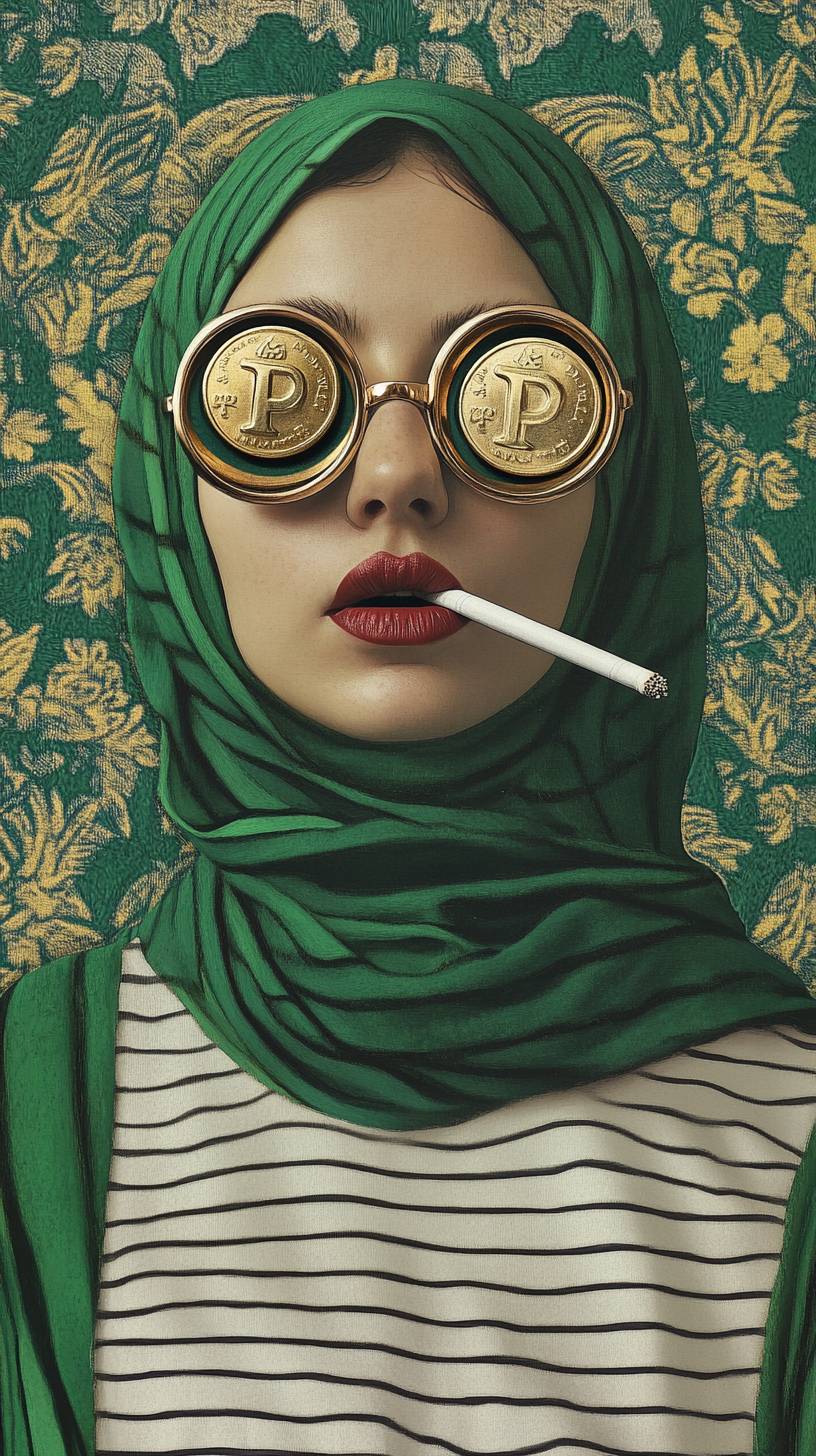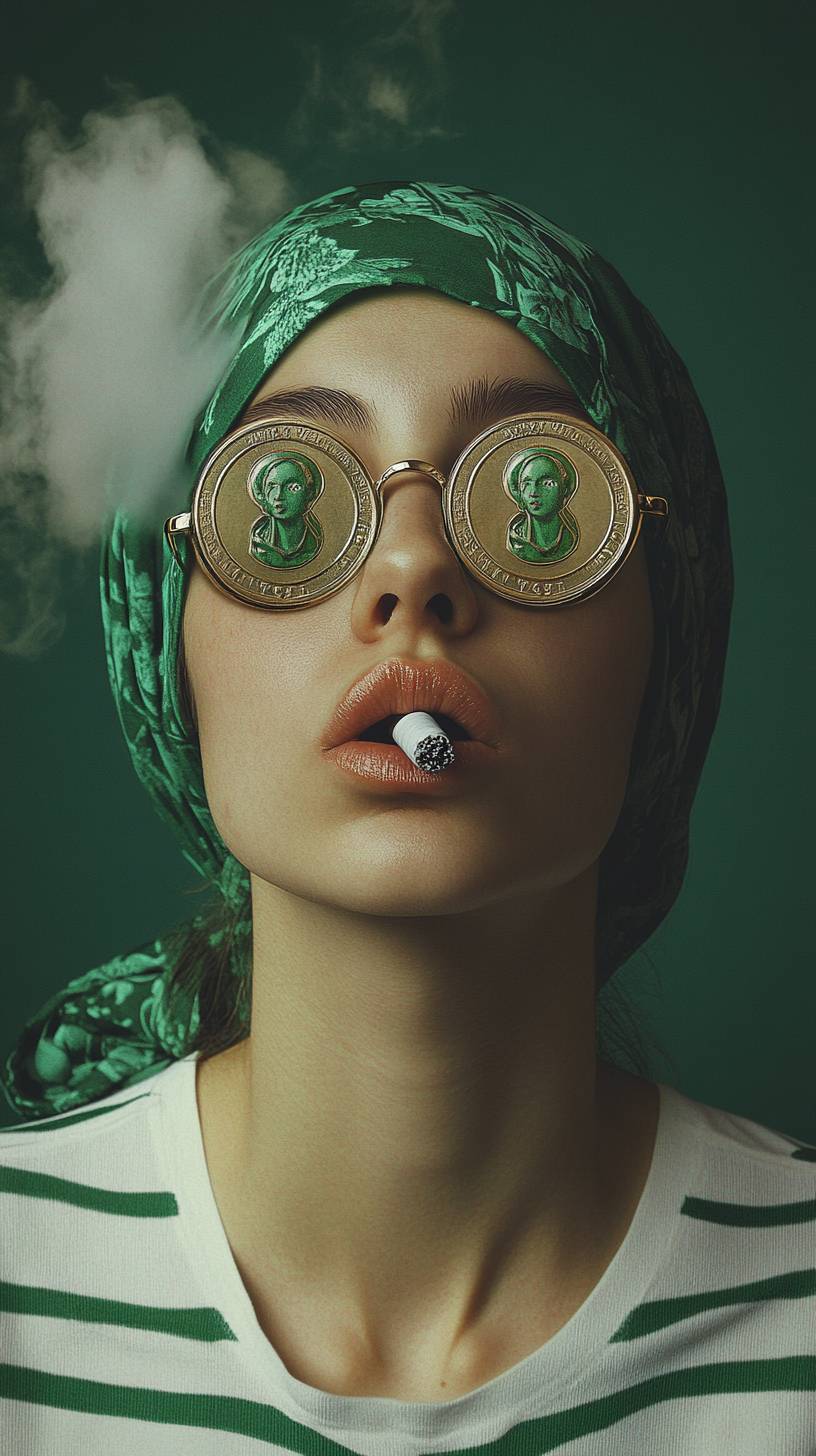 A girl with two pepe coin in her eyes, wearing a white and green striped t-shirt and a green headscarf, smoking a cigarette. The picture is in a surreal collage style like matisse, Magritte , with exaggerated glasses. --ar 9:16 --v 6.1