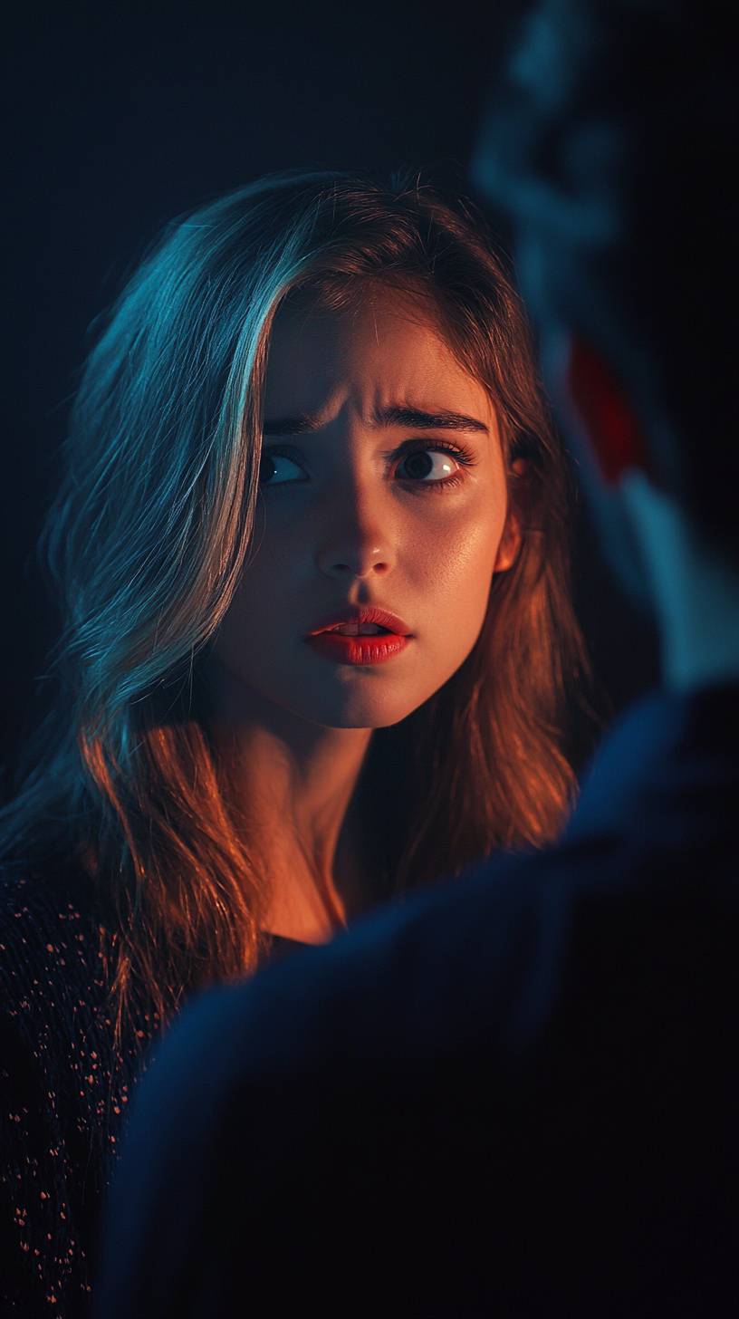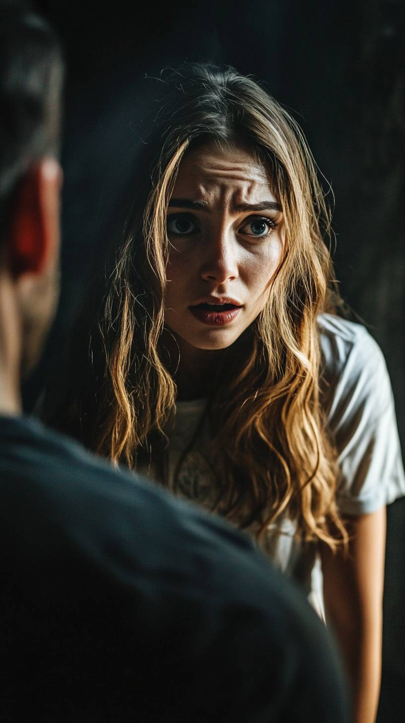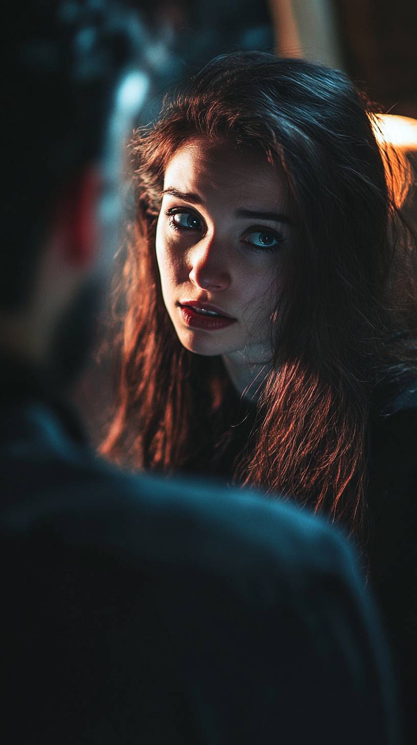 25 to 35 year old single woman, speaking with a man, looking desperate, poor vibes, dark light shining on her, scene, --ar 9:16 --v 6.1