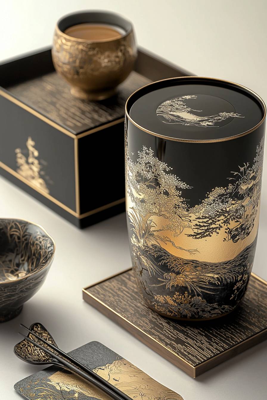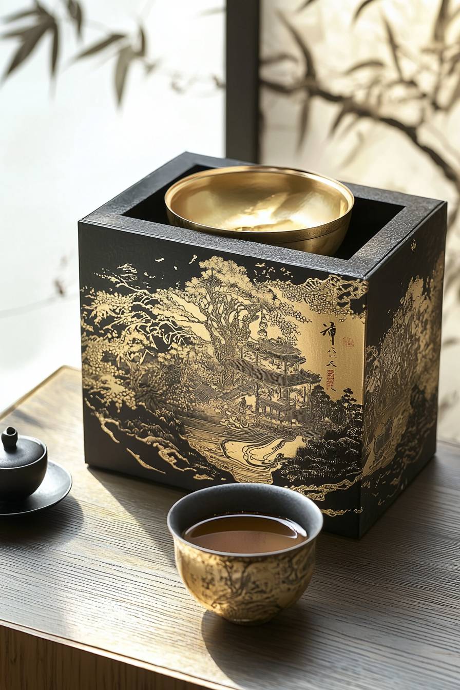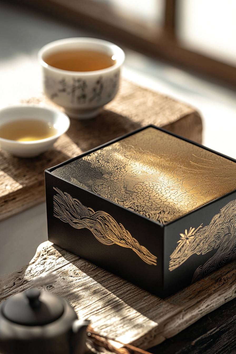 Product photography, set a studio scene, a luxury tea brand, a delicate Japanese lacquerware black box package featuring a luxury Japanese pattern Kasumi, with a delicate tea cup nearby, all placed on a traditional Japanese wooden table against a white background under artificial lighting.