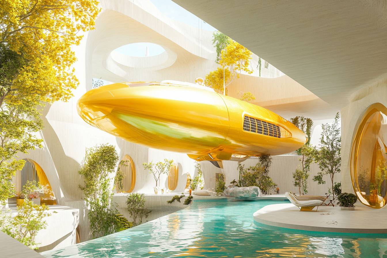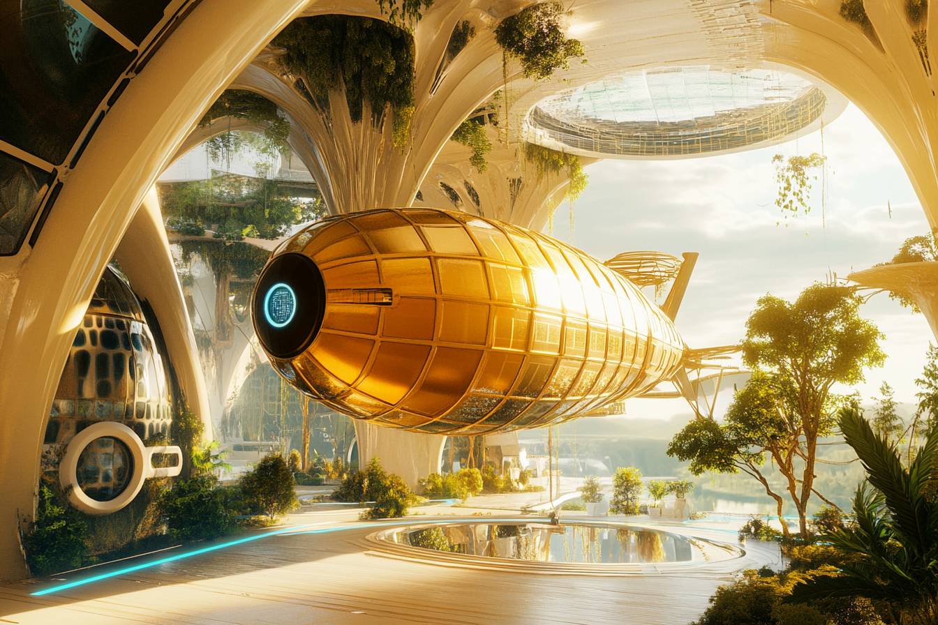 A solar-powered airship integrated into a Solarpunk Ecotopian Vision, showcasing a sustainable future where technology and nature coexist. Use natural light and a harmonious palette of golden yellow and soft turquoise to evoke optimism and balance.