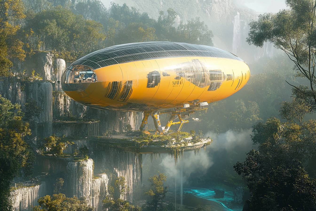 A solar-powered airship integrated into a Solarpunk Ecotopian Vision, showcasing a sustainable future where technology and nature coexist. Use natural light and a harmonious palette of golden yellow and soft turquoise to evoke optimism and balance. --ar 3:2 --style raw