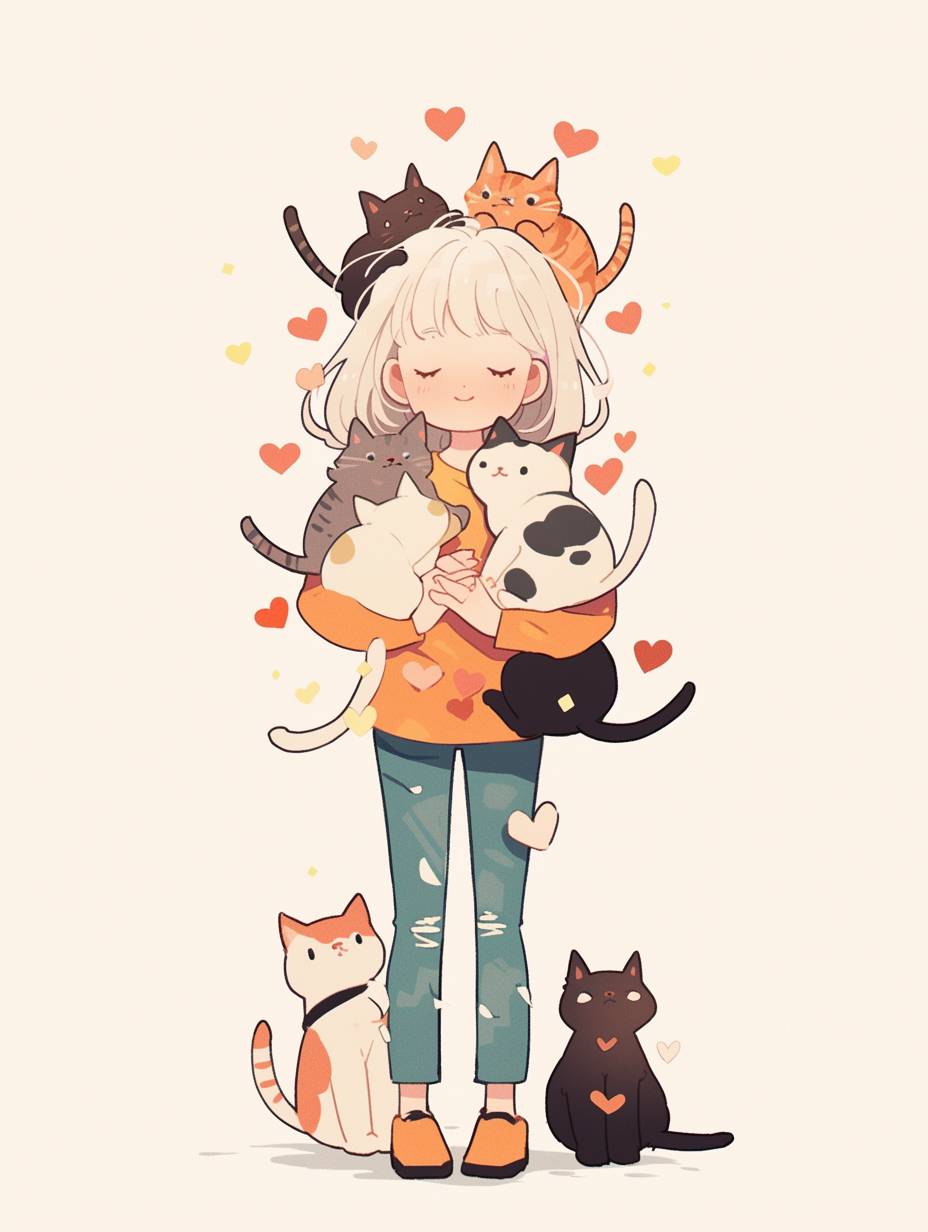 A cute girl with white hair is surrounded by cats, in a simple doodle style, a flat illustration, a full-body portrait, with colorful cartoon characters, doodles in orange and green colors, simple lines forming hearts around her head, a full-body view, in a standing pose, wearing a yellow T-shirt and blue pants, with a happy expression, against a white background, in high resolution, with high detail, and high quality. --ar 70:93 --niji 6