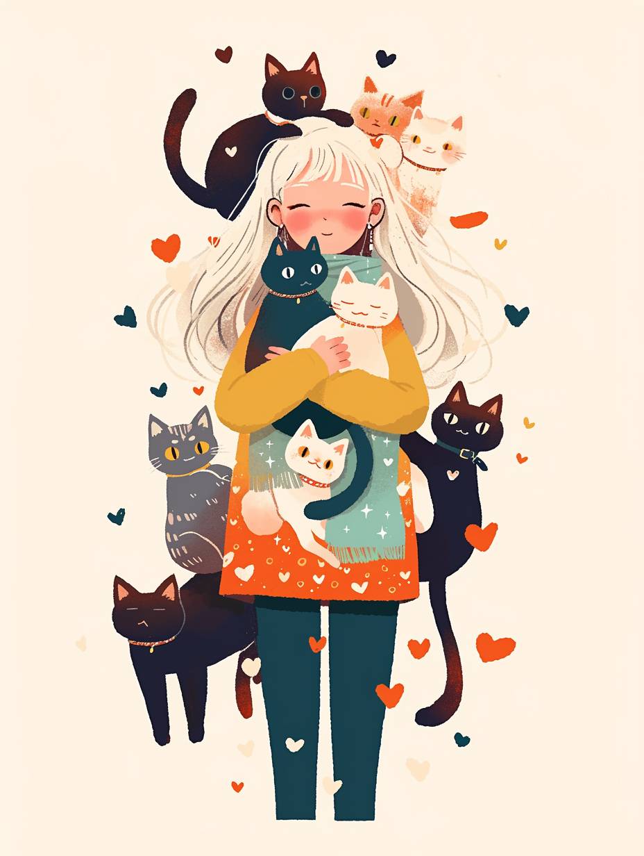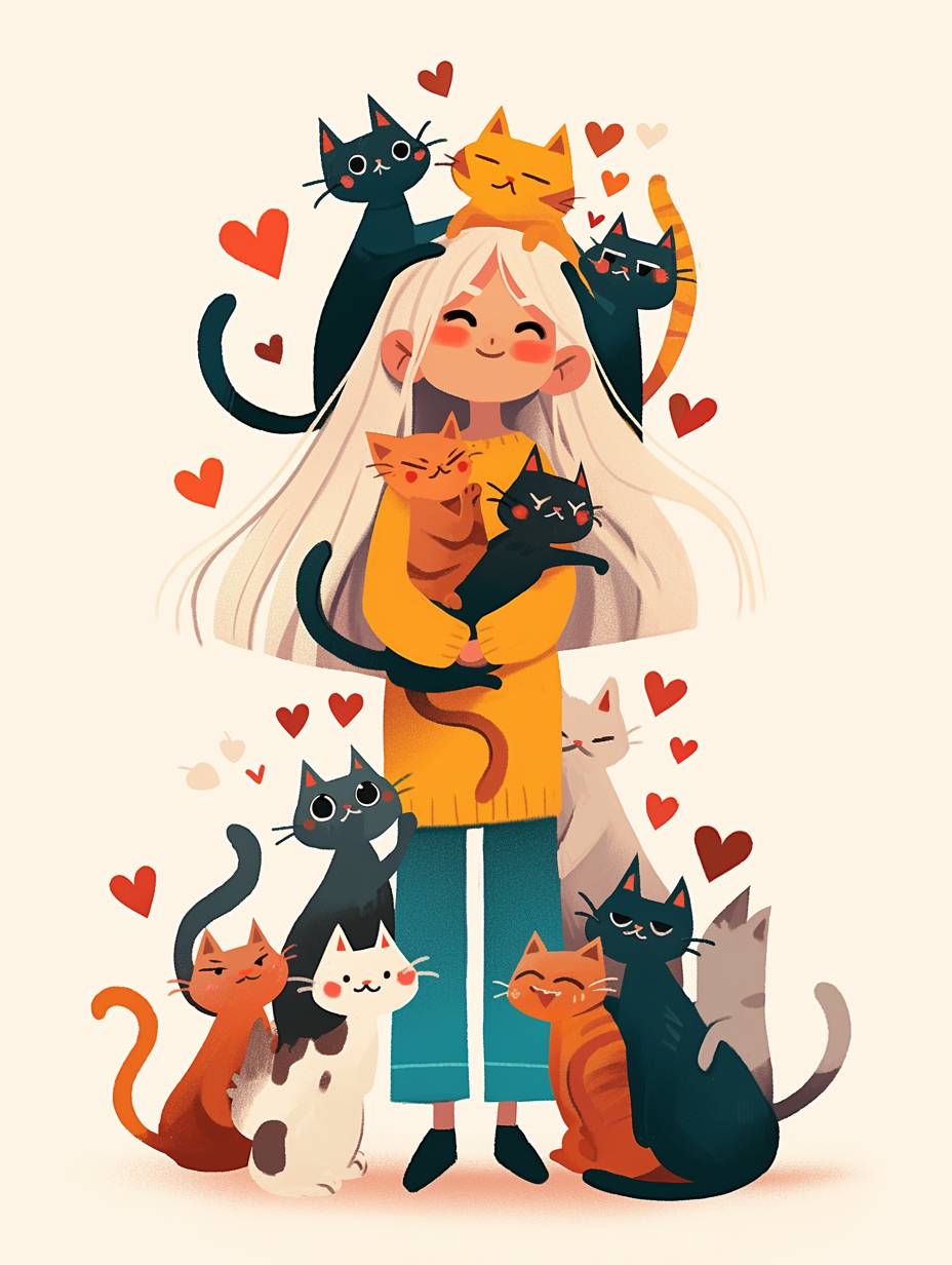 A cute girl with white hair is surrounded by cats, in a simple doodle style, a flat illustration, a full-body portrait, with colorful cartoon characters, doodles in orange and green colors, simple lines forming hearts around her head, in a standing pose, wearing a yellow T-shirt and blue pants, with a happy expression, against a white background, in high resolution, with high detail, and high quality.