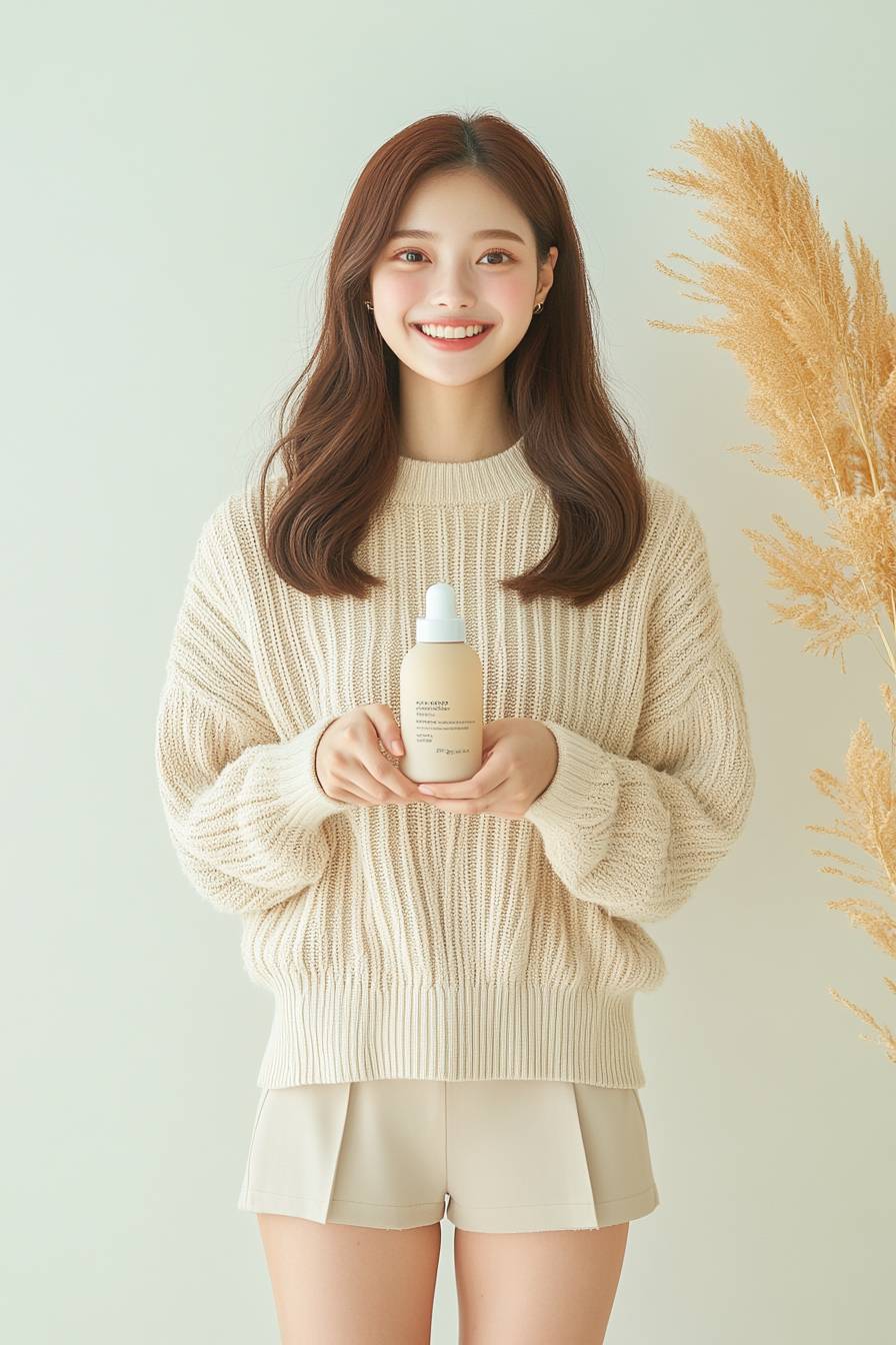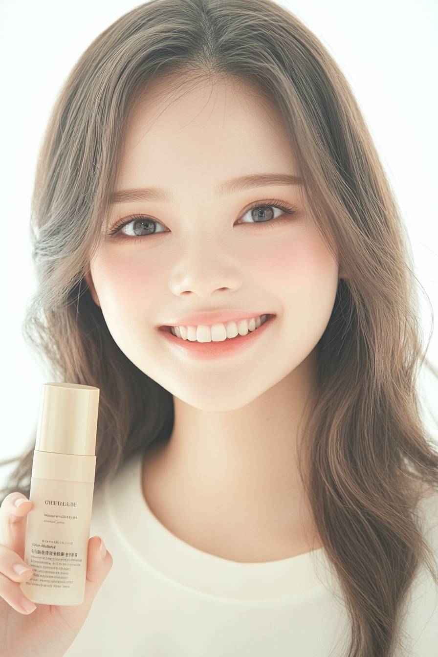Skincare photography, in muji style, close up shot, Japan model with happiness expression, she is holding a serum bottle near her face, set a studio scene, natural light, focus on model face and the product --c 10 --ar 2:3 --style raw --sref 3622860395 --sw 120 --s 300 --v 6.1 --p ndbewqk