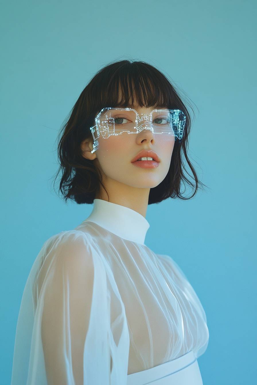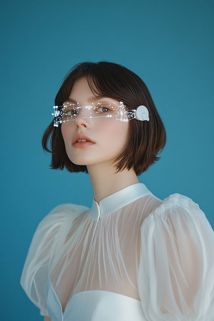 Medium size shot, 3/4 profile looking at the camera, Hasselblad shot of a beautiful white woman with brunette bob hair in a sheer white satin minimalistic dress with a minimalistic satin belt at the waist, subtle cyborg features on face and neck with tiny, flat, thin, white, transparent electronic pieces inlaid on her skin, on a baby blue background, magazine style.