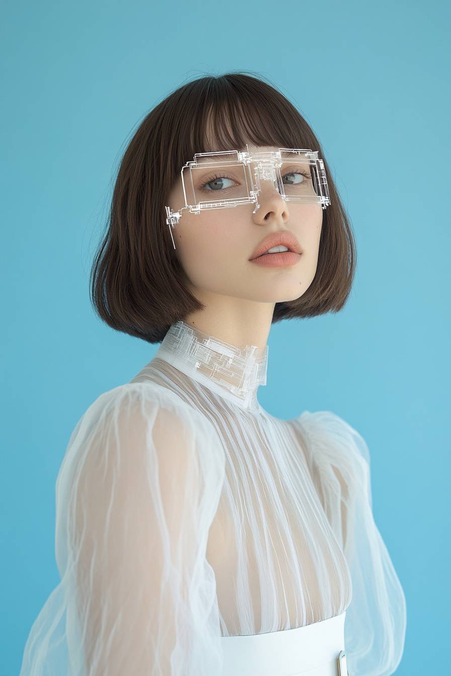 medium size shot, 3/4 profile looking at the camera, Hasselblad shot of a beautiful white woman with brunette bob hair in a sheer white satin minimalistic dress with a minimalistic satin belt at the waist, subtle cyborg features on face and neck with tiny, flat, thin, white, transparent electronic pieces inlaid on her skin, on a baby blue background, magazine style --ar 2:3