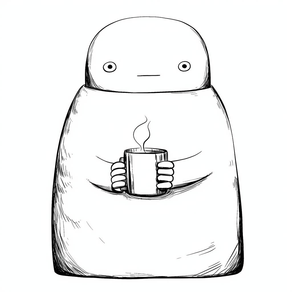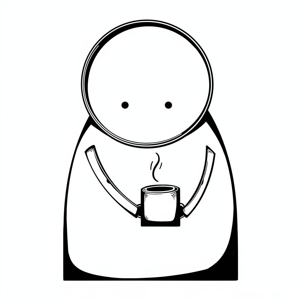 Minimalist line drawing, black and white style. The image is a simplified character with a circular head and a curved body. There are two round eyes and a straight mouth on the head. The character holds a steaming cup. The overall design is very simple, like casual graffiti, giving a gentle and friendly feeling. --ar 1:1 --style raw --stylize 50 --niji 6