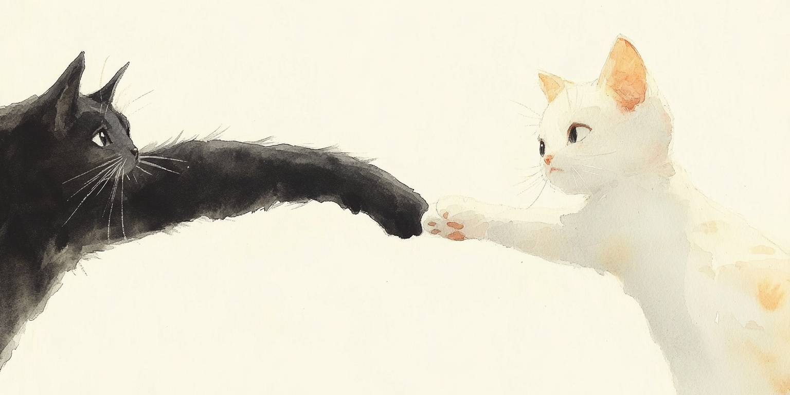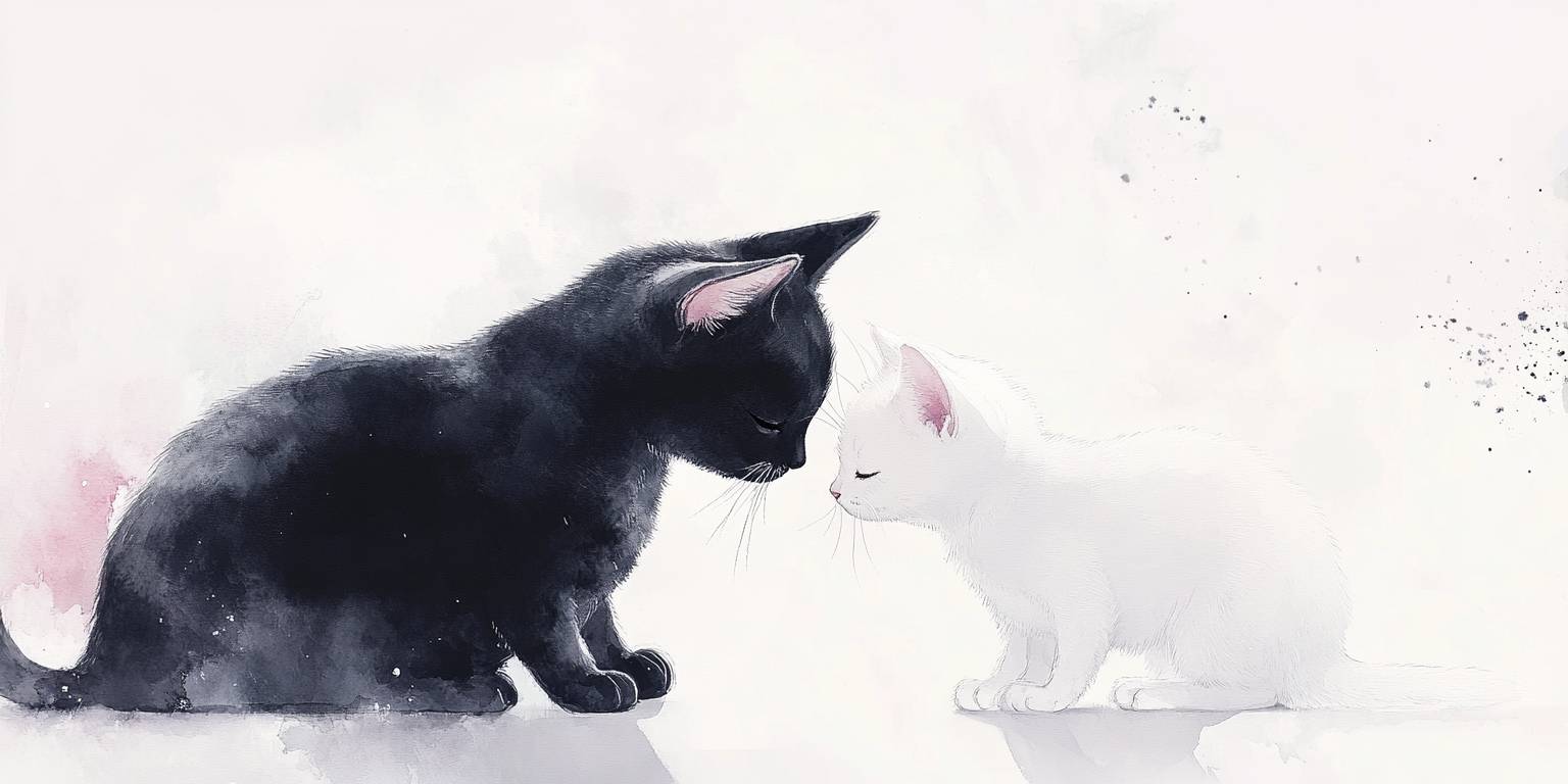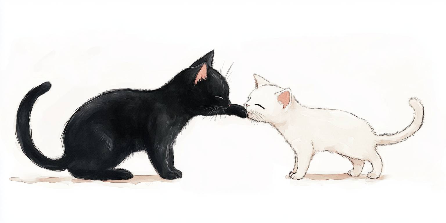 Watercolor painting of a black cat and a white cat's gentle interaction