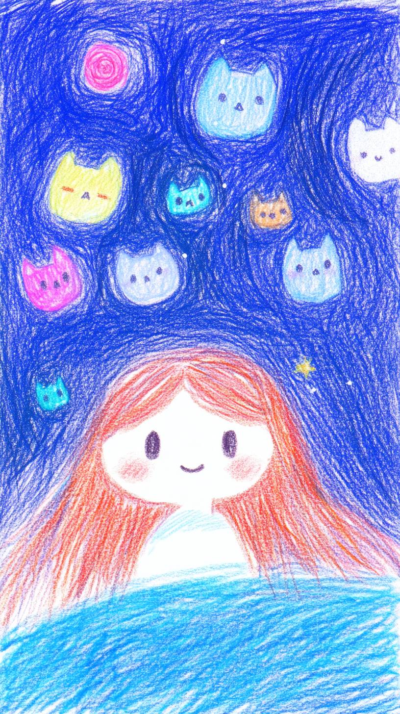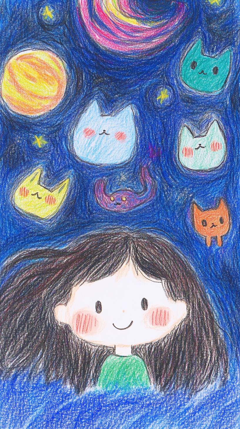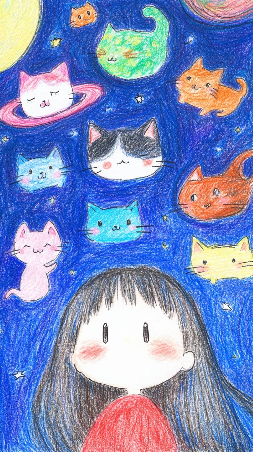 A whimsical illustration of a girl surrounded by adorable kittens in a vibrant galaxy setting. The scene features the girl with bright, cheerful expressions, her hair flowing like the cosmos, dotted with stars. The kittens, each with unique patterns and colors, playfully float around her, their eyes wide with curiosity. The background is a mesmerizing blend of deep purples, blues, and pinks, representing the galaxy, with twinkling stars, swirling nebulae, and distant planets. The style is anime-inspired, with bold outlines and a dreamy aesthetic, capturing the enchanting bond between the girl and her feline friends in a magical universe --ar 9:16 --sref 794311140 --personalize kzilt9y --v 6.1