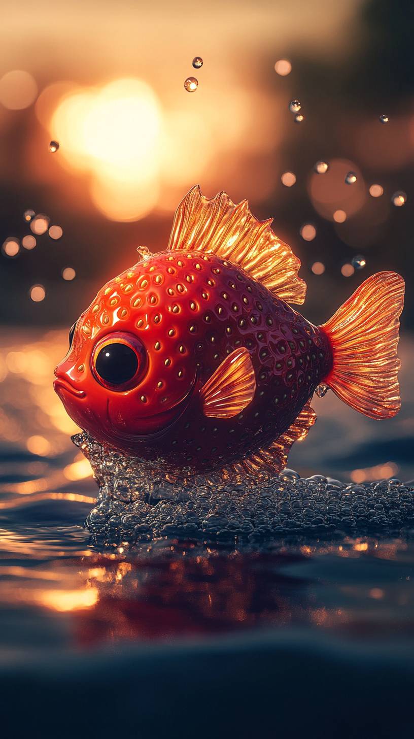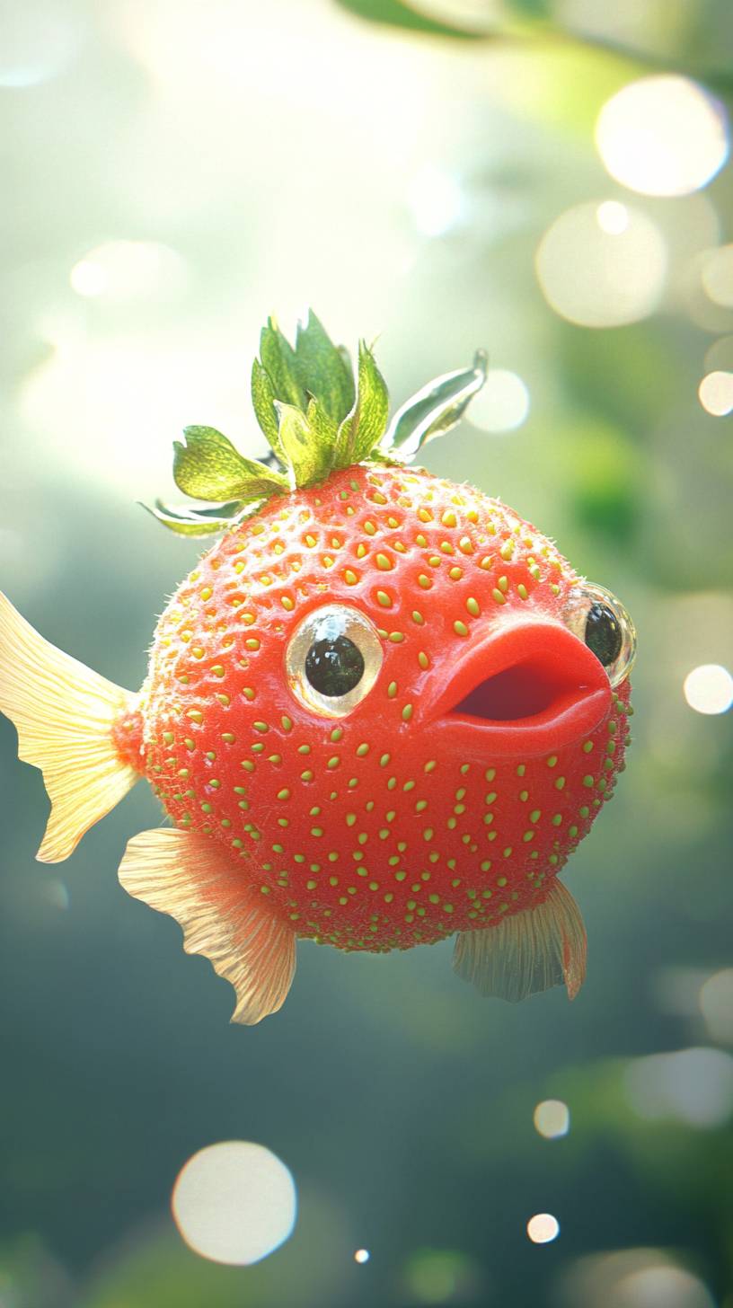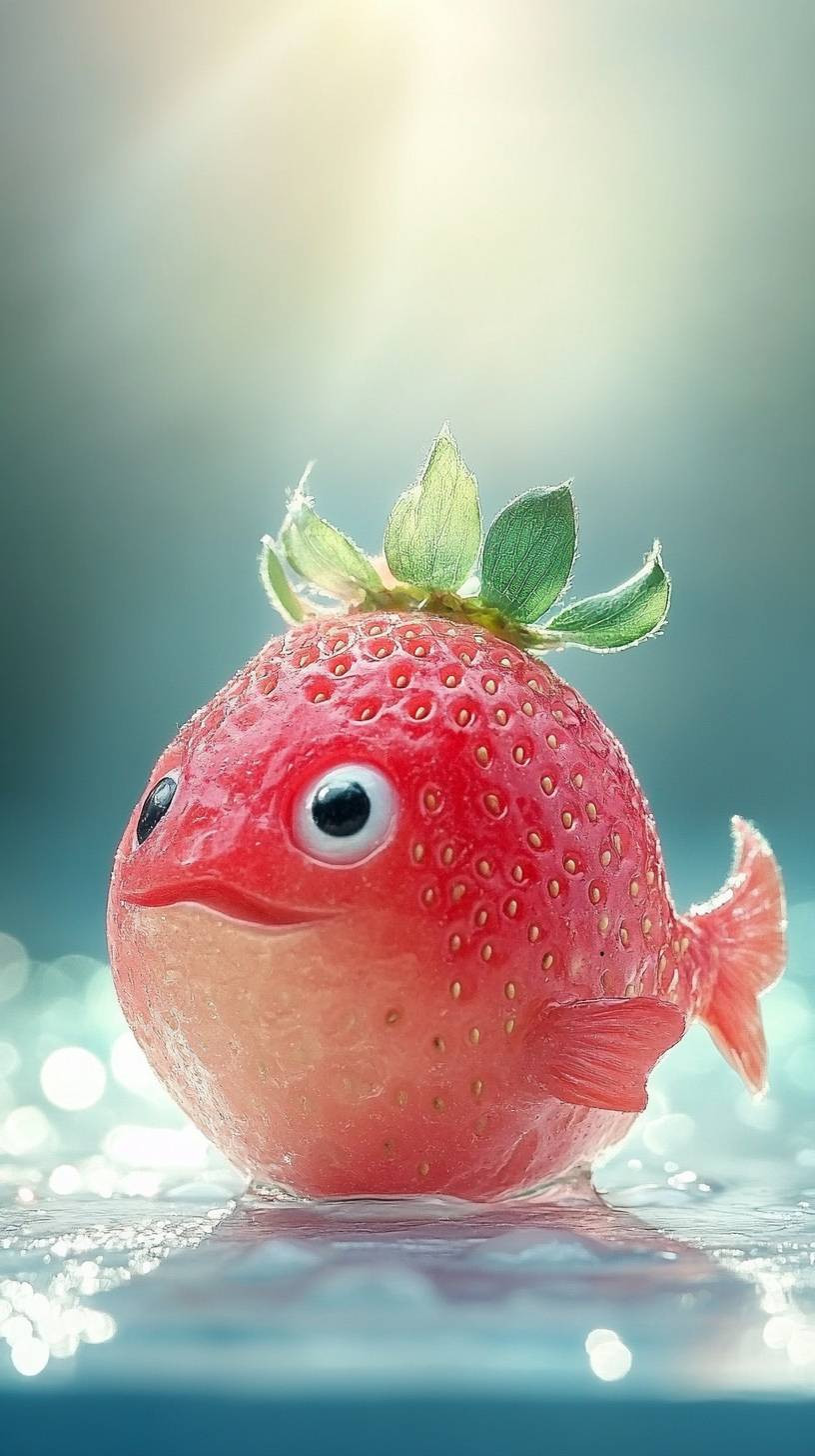The fat round fish made of red strawberry, gleaming under the sunlight like a ripe fruit. a strawberry made of a fish in the style of cute, photo-realistic, minimalist photography, dreamlike animal --chaos 10 --ar 9:16 --v 6.1
