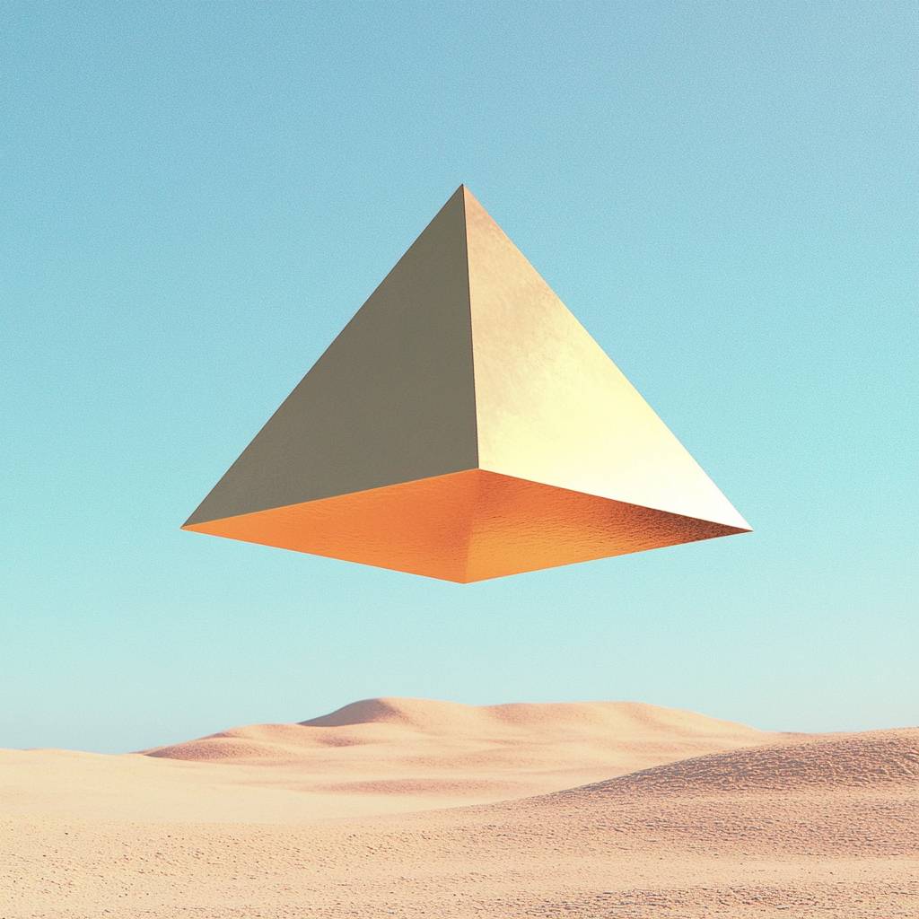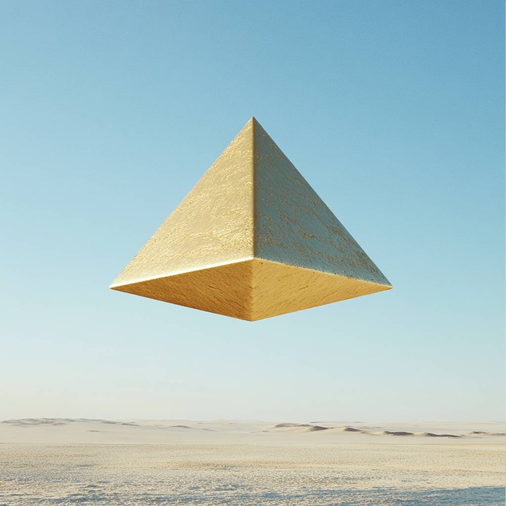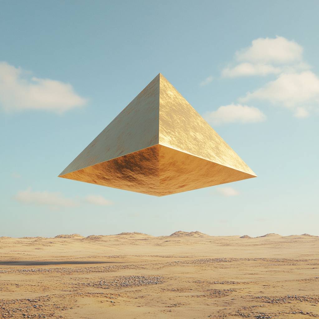 A smooth golden pyramid floating against a soft blue sky and desert landscape.