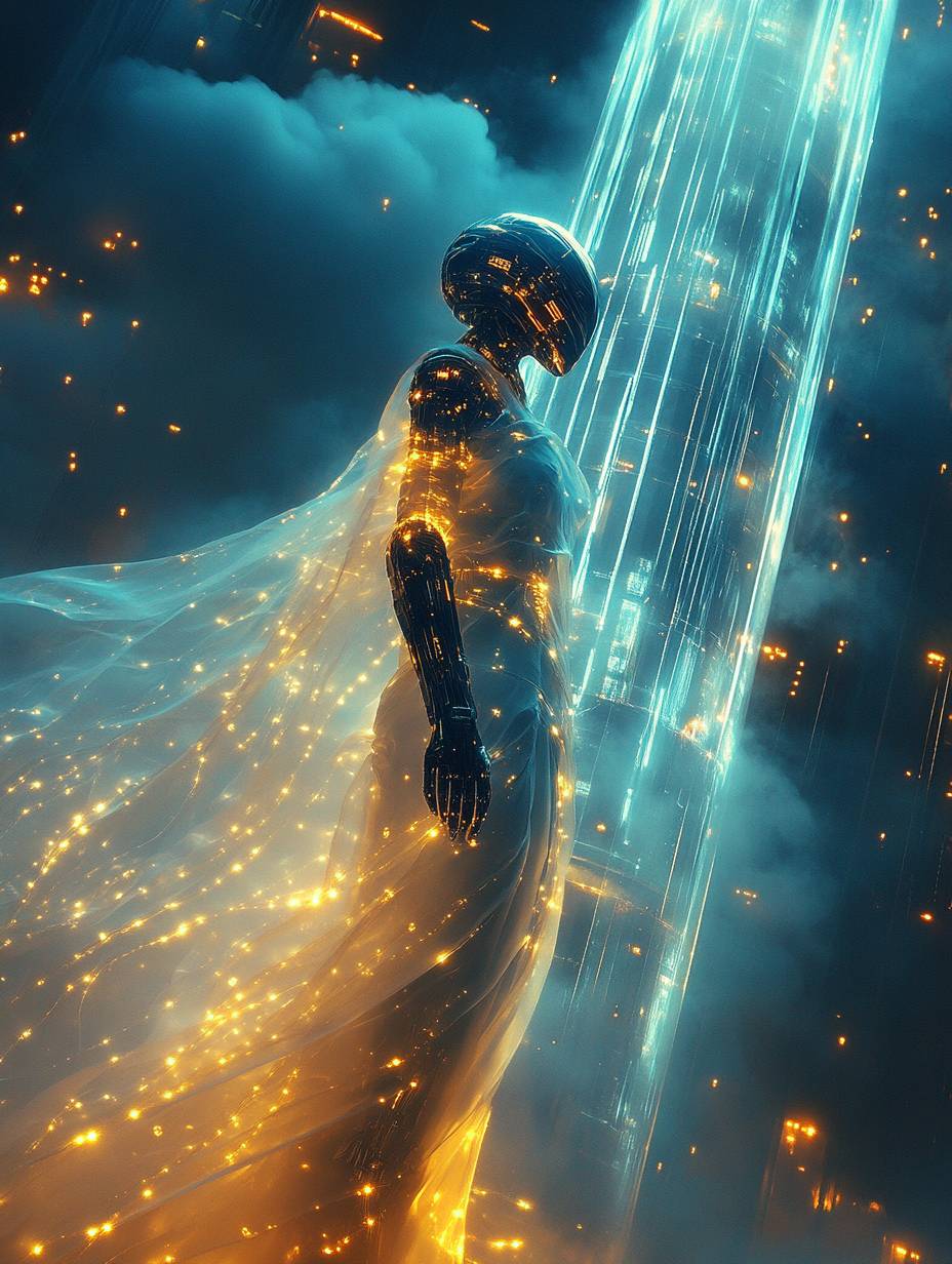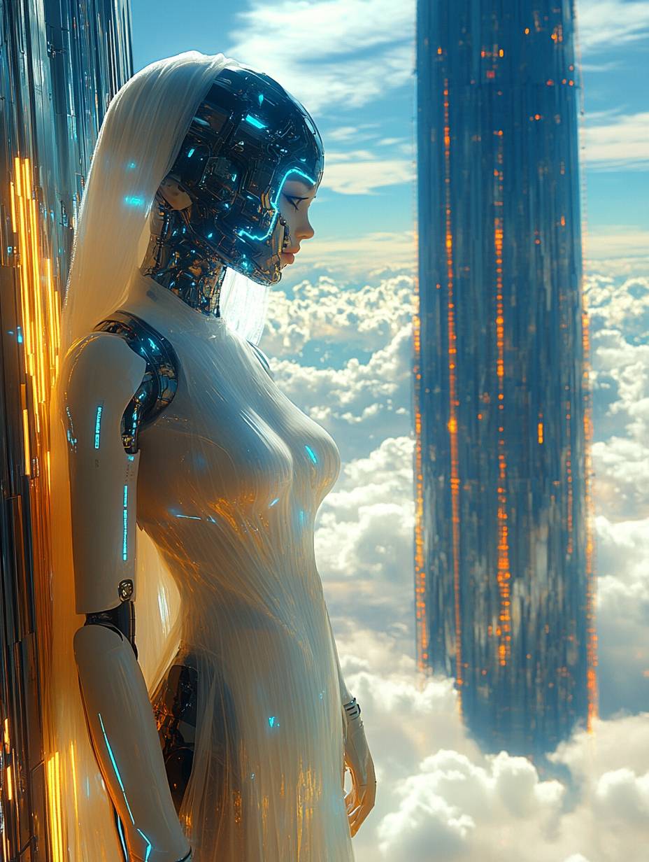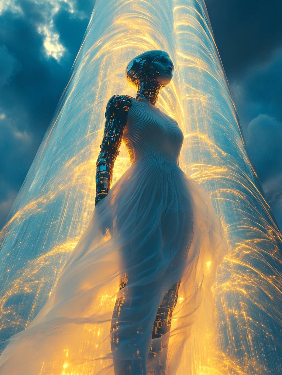 master shot of a Greek cyborg goddess, wearing an intricate technological suit with a sheer white georgette frills with swirls dress, standing in a big futuristic temple with very tall colossal column, tones in black, blue, and yellow, clouds are surrounding everything --chaos 10 --ar 3:4 --sref 4294000000 --v 6.1 --stylize 750