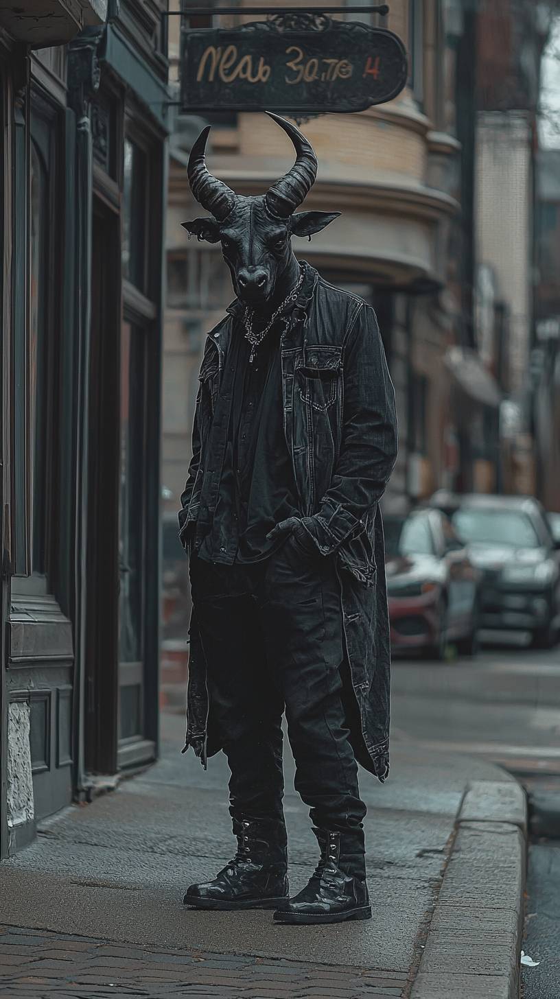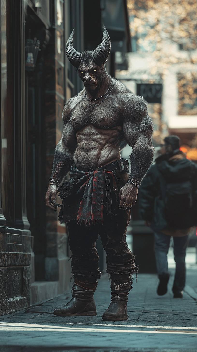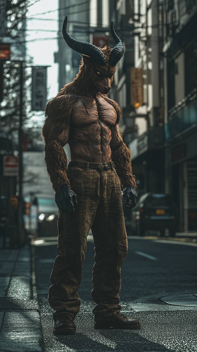human Minotaur hybrid standing half human with human standing 8ft tall clothing on on a street corner photorealistic cinematic intense Sony α7R IV, FE 35mm f/1 .4 GM --ar 9:16 --quality 2 --style raw --v 6.1