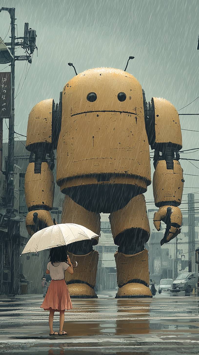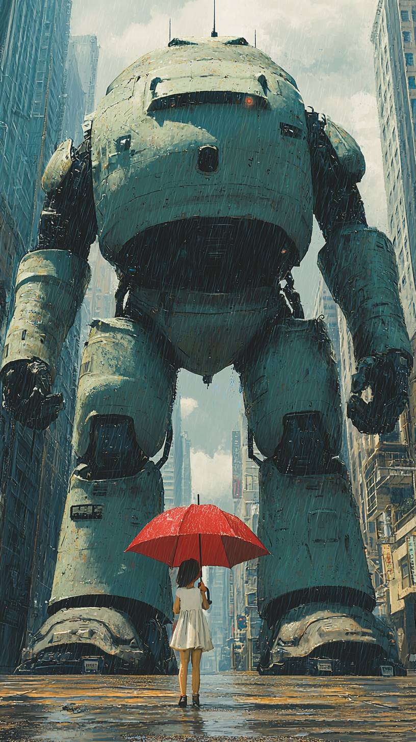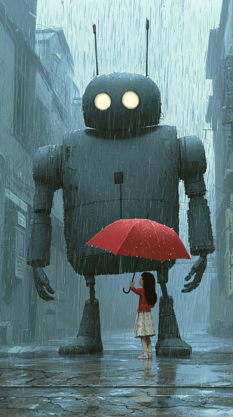 Colorful pop art artwork about a mighty gigantic robot receiving a umbrella from a toddler girl to cover him because of the heavy rain in a desert city square in a rainy day. Heavy rain, dark atmosphere, artwork by boris Vallejo, mordillo and robt williams, pastel colors and thicks contours, markers and pencil and watercolors --chaos 20 --quality 2 --style raw --personalize jkpkybv --stylize 300 --v 6.1 --ar 9:16