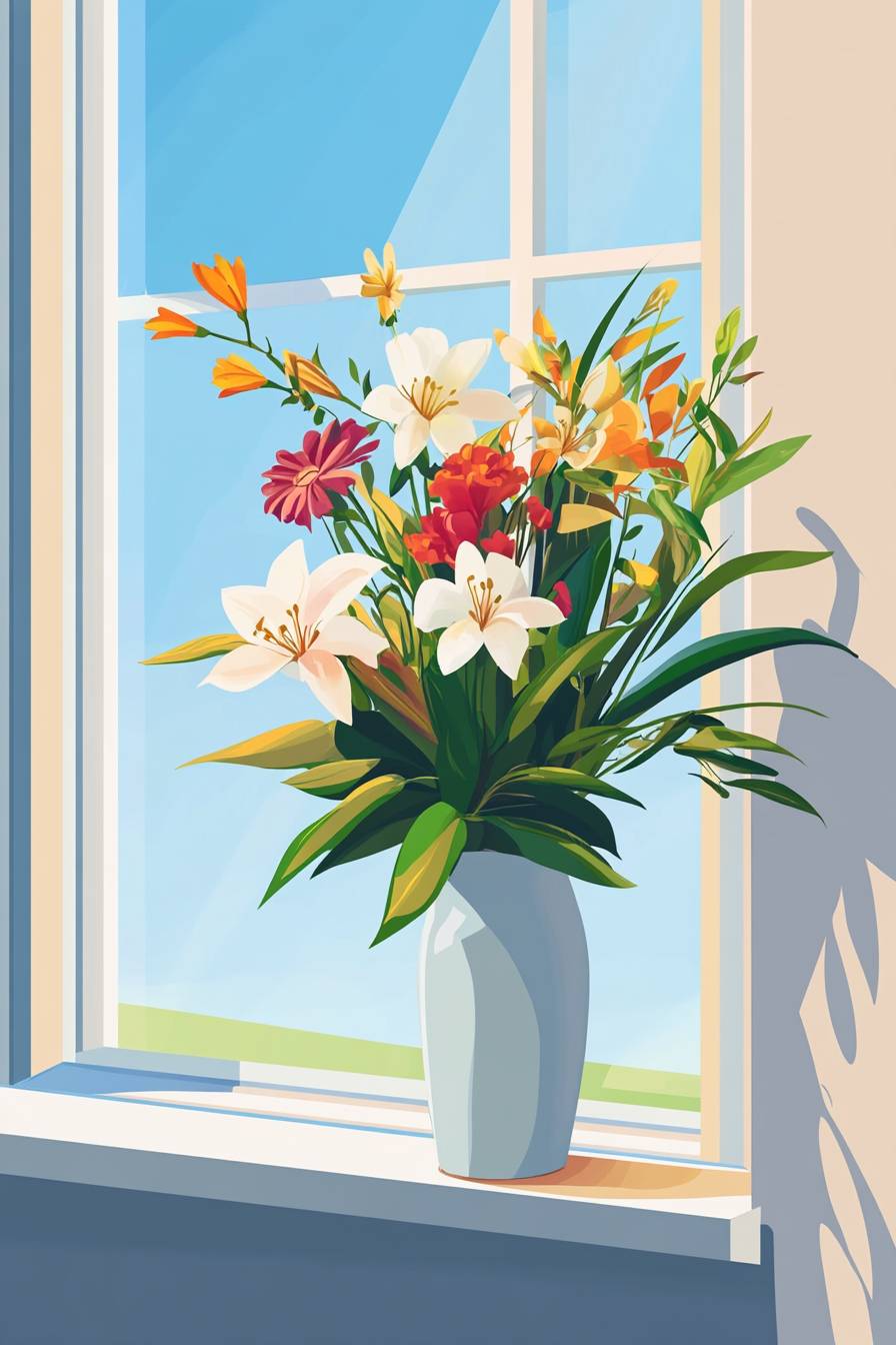 A flower arrangement vase placed by the window, sky blue outside, colorful flowers, isometric visual, neutral beige color wall.