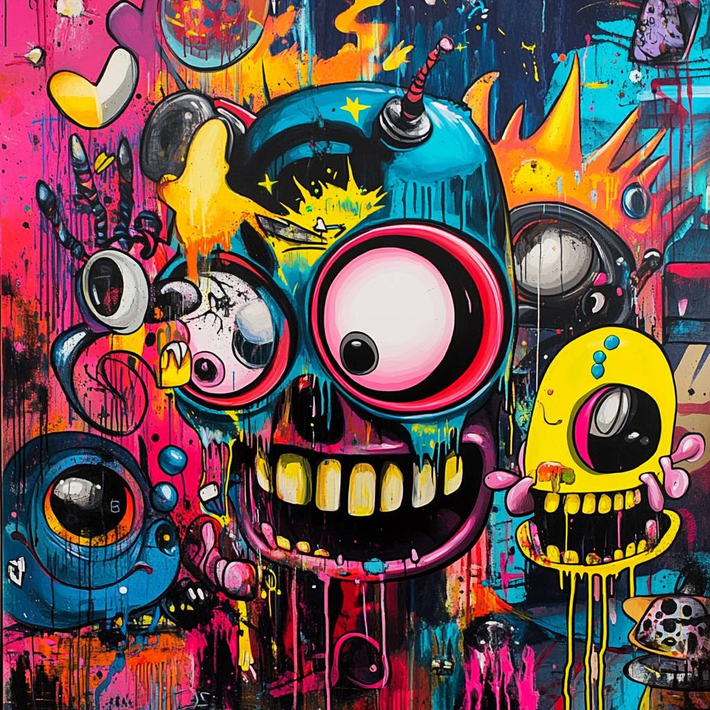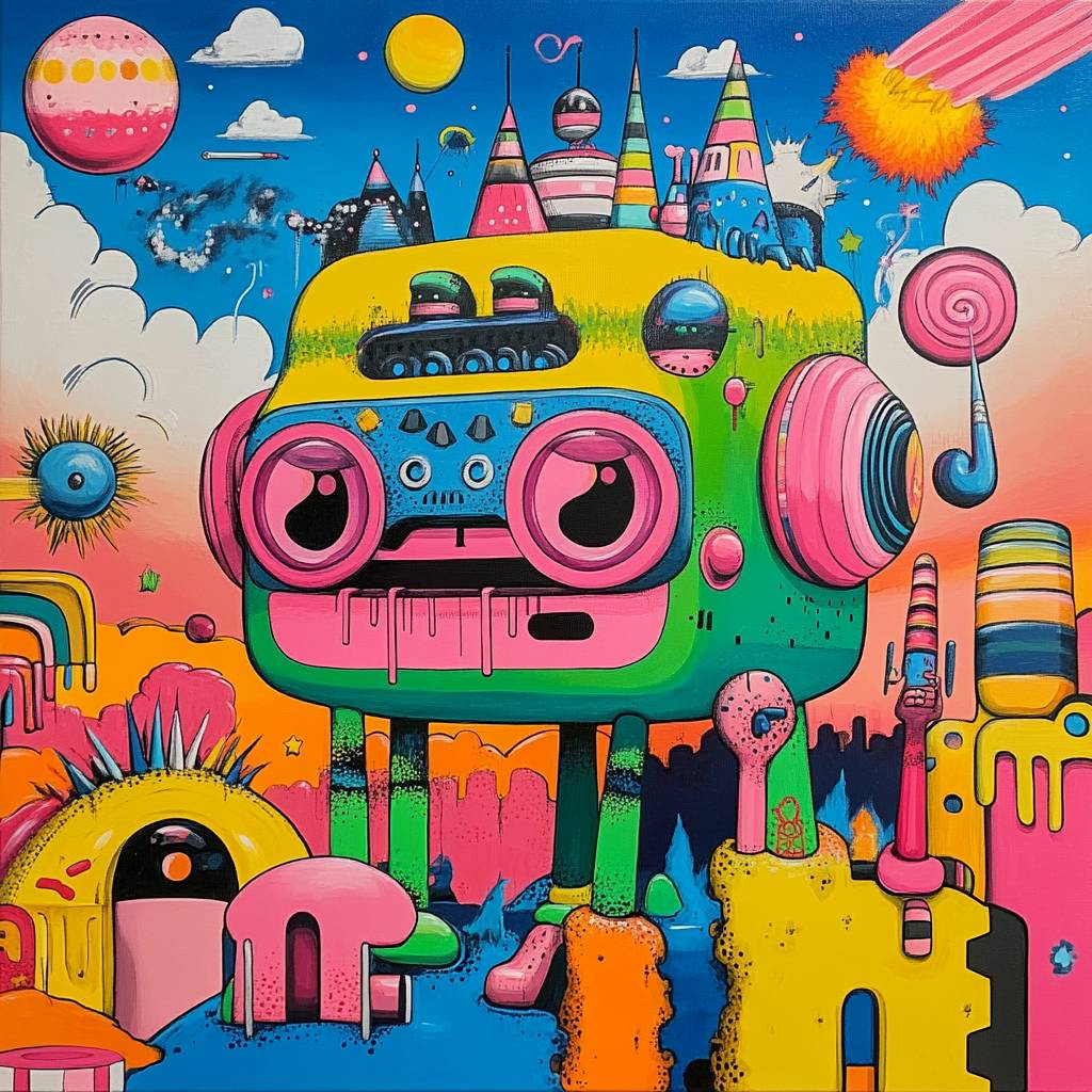 [SUBJECT]. Brightly colored pop culture-inspired artwork with playful motifs, blurring the lines between high art and commercialism