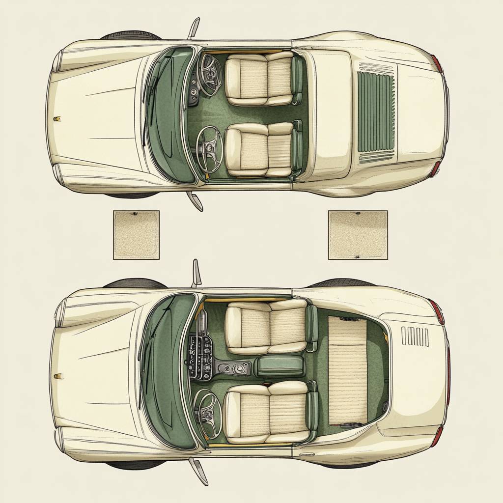 Design for a 1969 Porsche 912 long wheelbase, left-hand drive, in light ivory with a classic exterior featuring subtle patina. The interior features a light ivory color scheme, maintaining the original classic structure and layout. The seats are half-bucket style, upholstered in light ivory leather with green and light gray accents and piping, preserving the classic seat shape. The dashboard retains its original design, covered in light ivory leather with green contrast stitching and original chrome details. The door panels are upholstered in light ivory with green and gray accents and vintage-style handles. The steering wheel is wrapped in light ivory leather with gray stitching, maintaining the classic shape. The roof lining is light gray, adding brightness to the interior while preserving a vintage feel. The floor features light ivory carpeting with subtle green and gray piping for a cohesive look. This design respects the classic Porsche 912 interior while refreshing it with a luxurious light ivory color palette and green and gray accents.